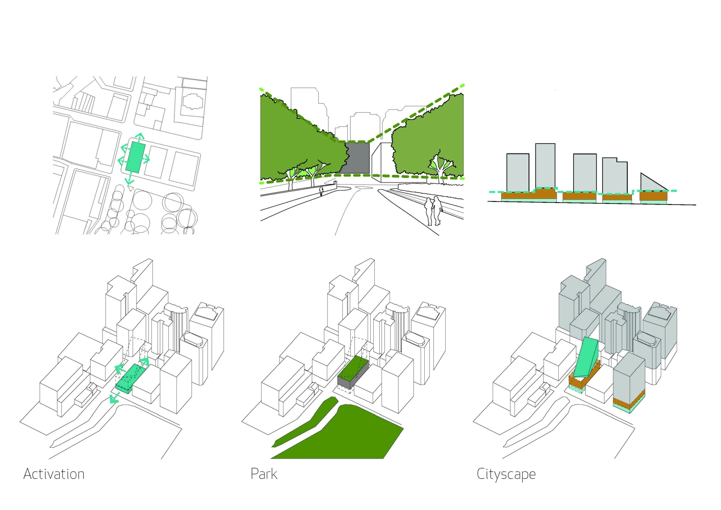 The project has a 3-part diagram that mediates these issues: a transparent retail base with a subterranean level lit from above; an urban block consisting of a potential mix of commercial or serviced apartments, and a living wedge at the top with premium apartments.