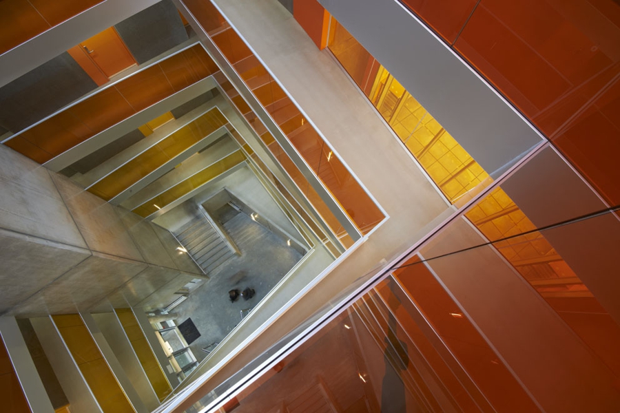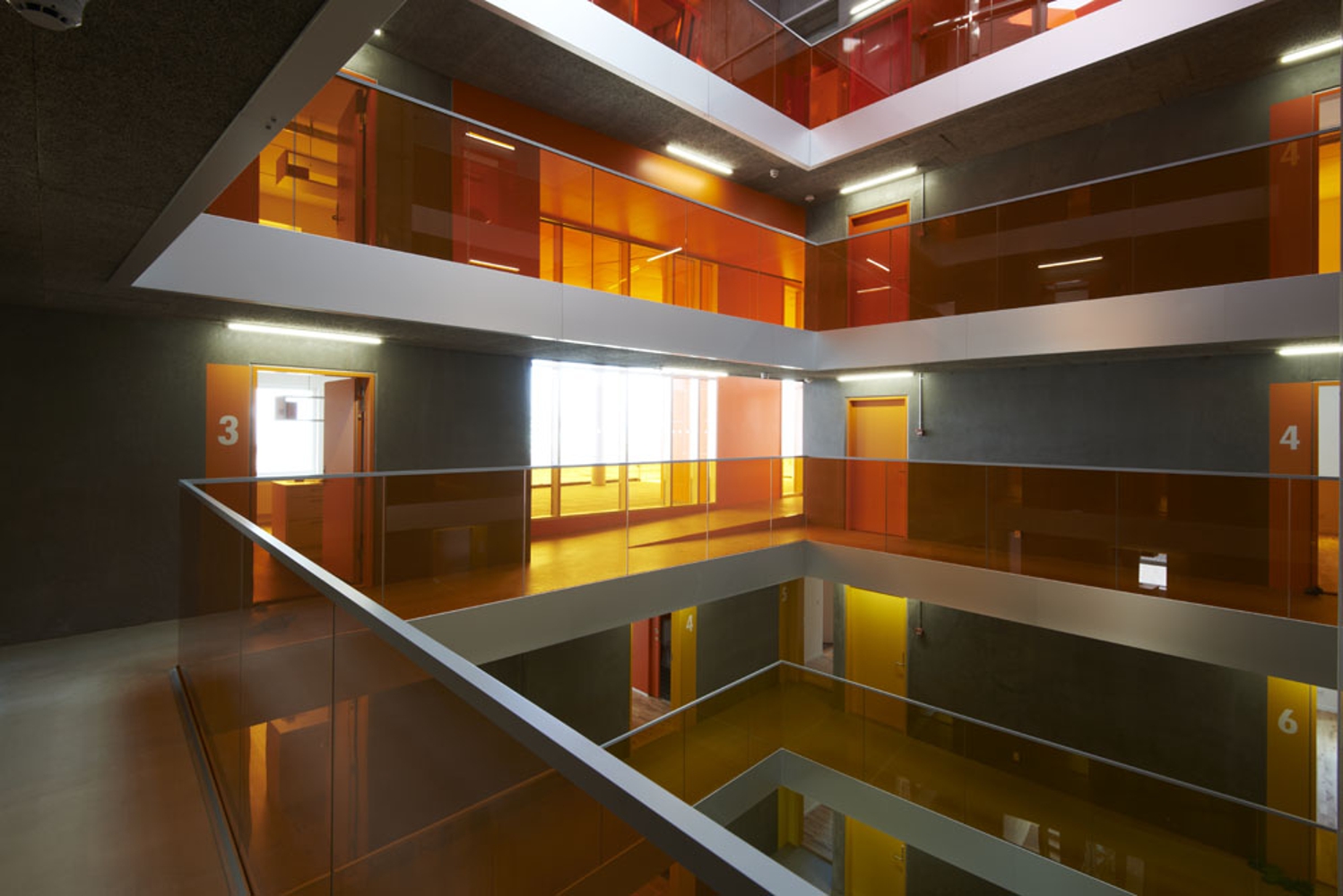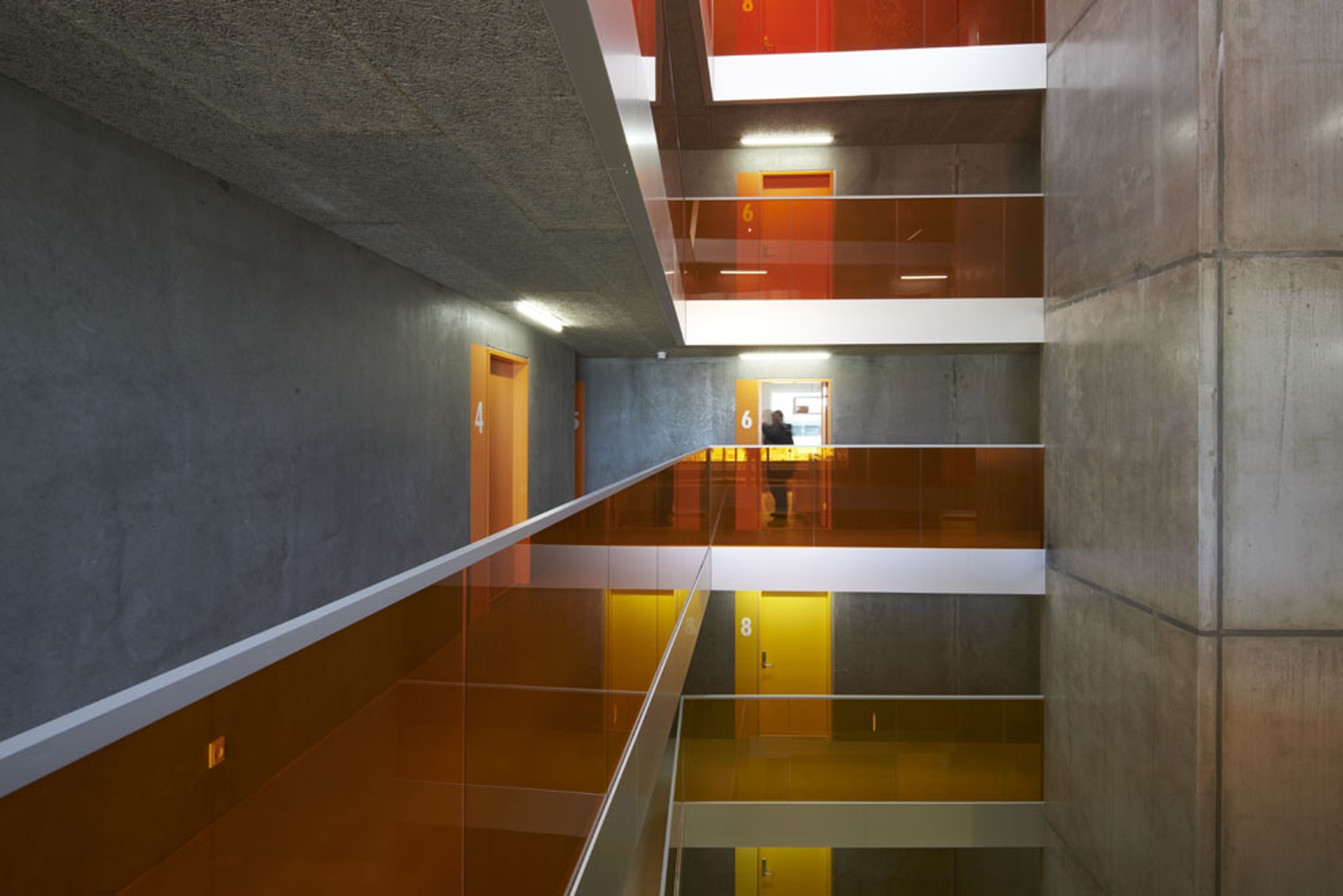 The judges commented on the building as follows: “The building’s architectonic main grip is connected, complex and rich in experiences. The architectonic expression is of a timeless monolith clad with concrete elements into which large cuts are made. The formal expression is intellectually challenging and genuinely original and atypical and beyond historical reference. The judging committee finds the dynamic dialogue between the building’s stringent monolithic form and the cheeky diagonal cuts which open the box to show its varied and colourful inner confirms this as a building for young people in the new part of the city.”