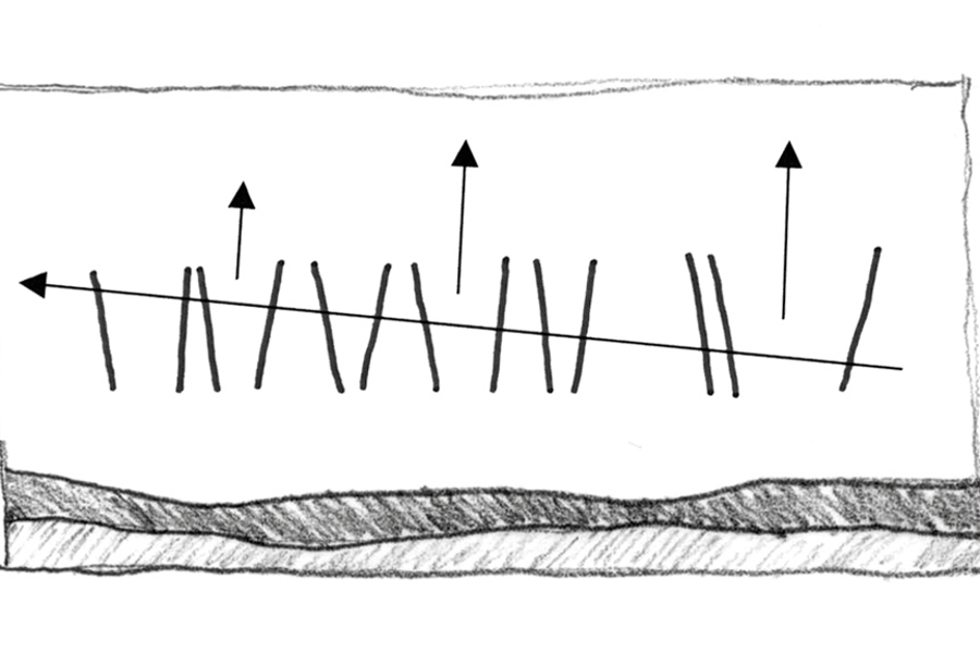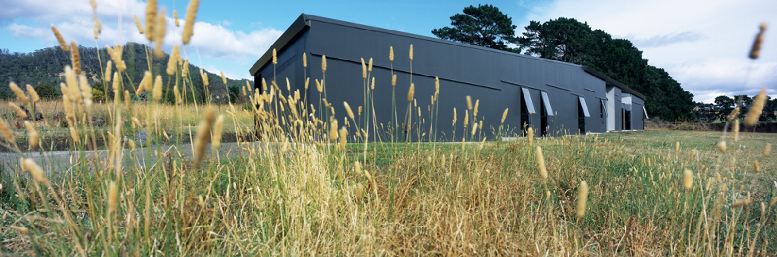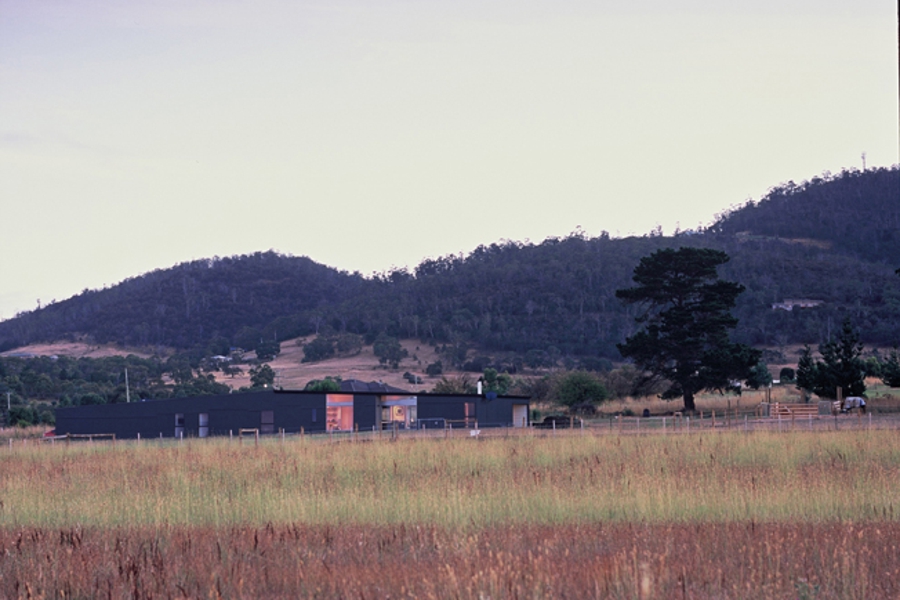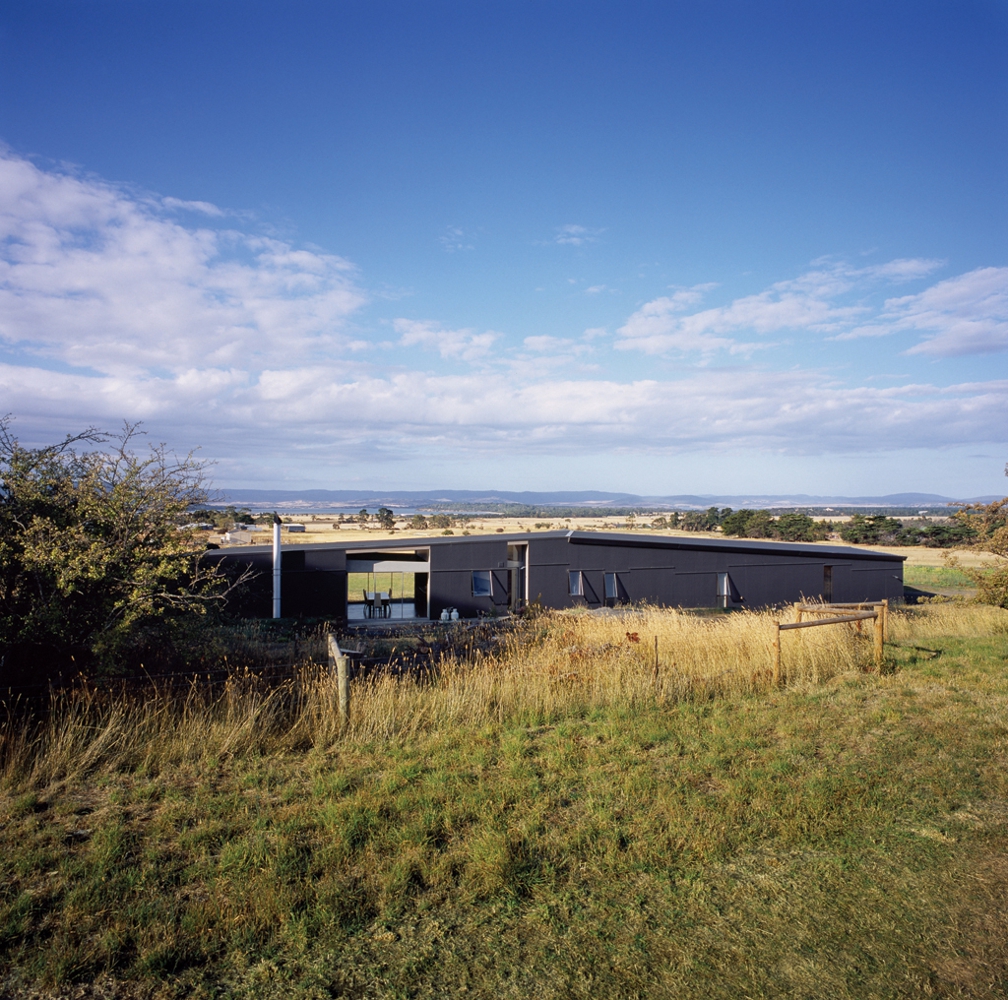 The house is a low-lying long, dark object placed centrally on the allotment in anticipation of the preservation of distant views and amenity when adjacent allotments are developed. The stretched house responds to the open landscape with which it seeks to engage, one of low-lying open fields and sheltered water-ways which folds into a neck of land adjacent to Hobart Airport. The setting is contained by a horizontal band of hills which define the bottom edge of a large sky view.