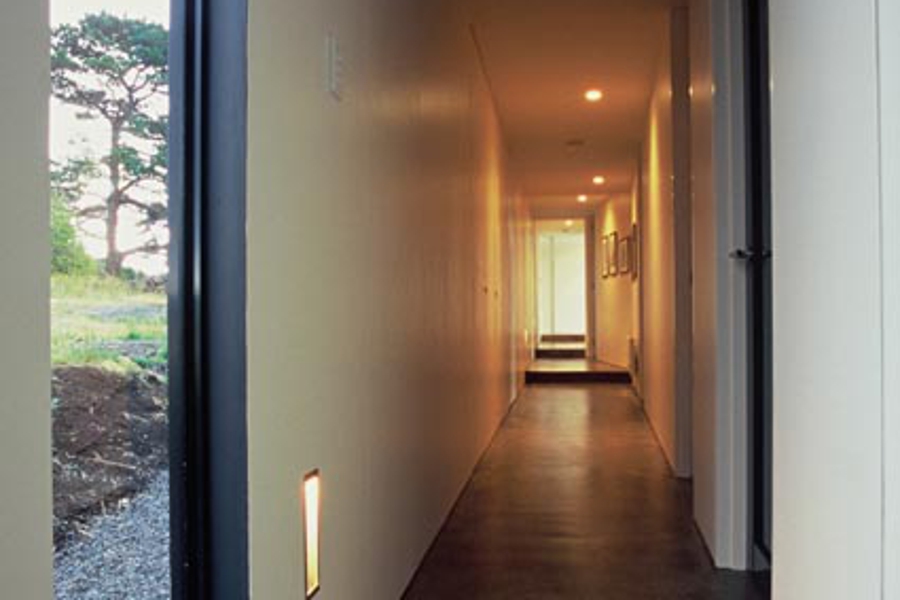 The building's exterior seeks to disappear like a stealth bomber into the shadows of the adjacent mature pine trees. In turn, this seemingly non-material "shadow" in the landscape provides a blunt background upon which a level of finessing - profiled gutters, broken flashing and window arrangements (including the TV satellite dish) are among many elements added-on in a "toy"-like manner. The blunt external envelope is contrasted by a dramatic interior - formed by breaks in the linear plan so that all spaces have a share of the view. The result is an internal sequence of varied spaces, each setting the occupant up in a different relationship to the external environment.