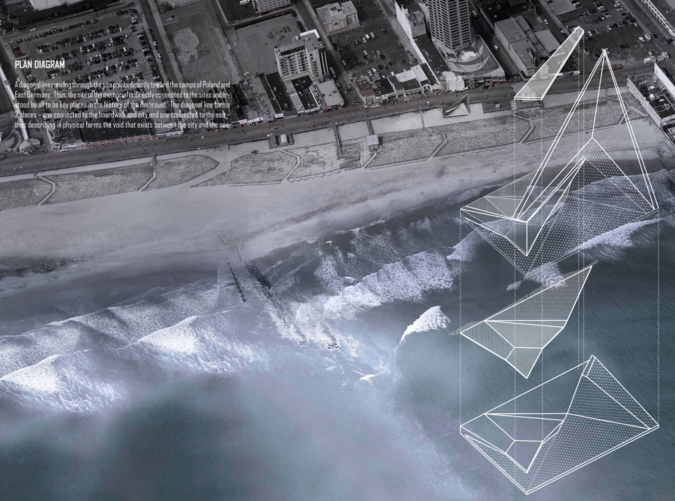 A diagonal line running through the site points directly toward the camps of Poland and East Germany. Thus, the site of the memorial is directly connected to the sites understood by all to be key places in the history of the Holocaust. The diagonal line forms 2 places – one connected to the boardwalk and city and one connected to the sea – thus describing in physical terms the void that exists between the city and the sea.