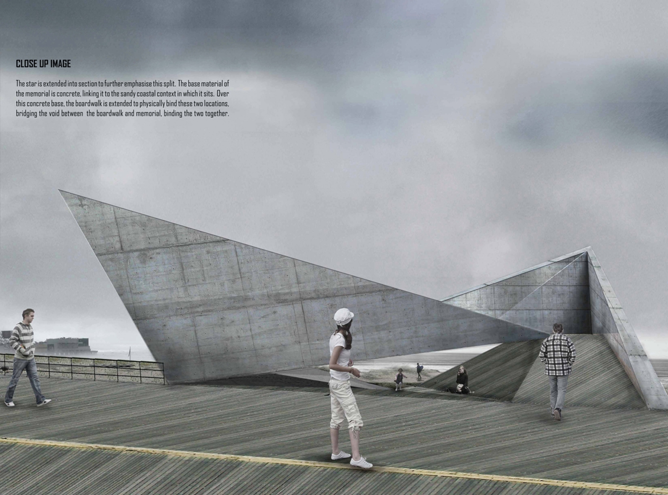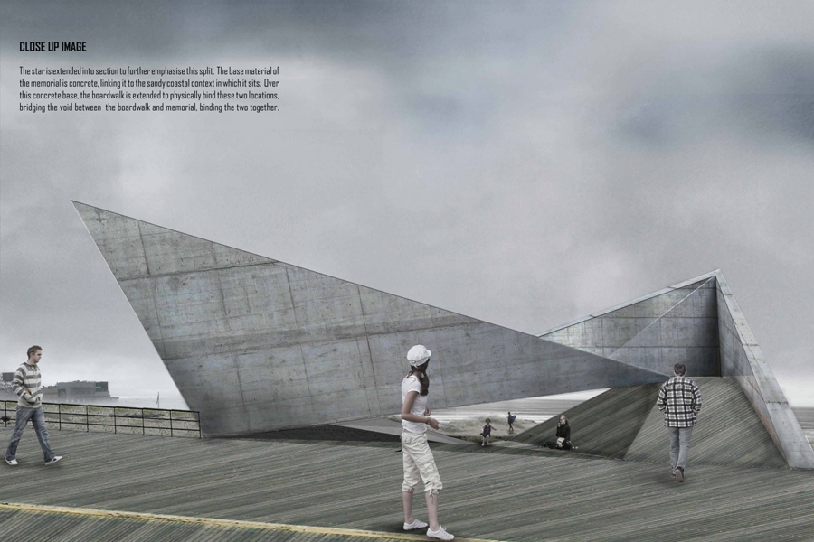 The star is extended into section to further emphasise this split. The base material of the memorial is concrete, linking it to the sandy coastal context in which it sits. Over this concrete base, the boardwalk is extended to physically bind these two locations, bridging the void between the boardwalk and memorial, binding the two together.