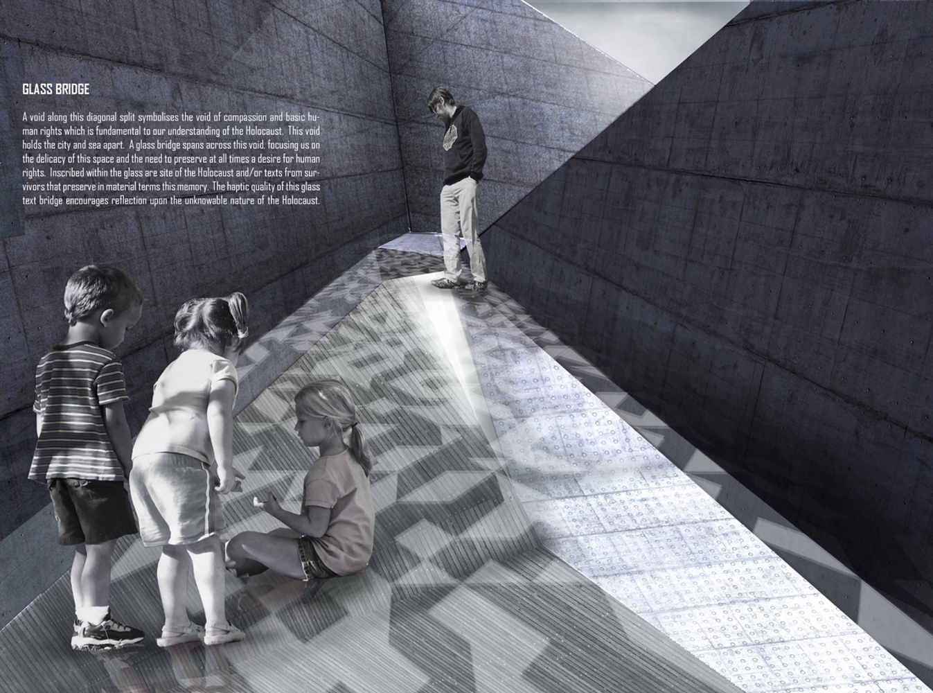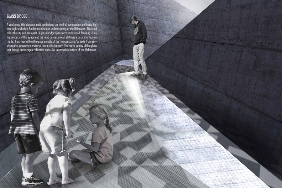 A void along this diagonal split symbolises the void of compassion and basic human rights which is fundamental to our understanding of the Holocaust. This void holds the city and sea apart. A glass bridge spans across this void, focusing us on the delicacy of this space and the need to preserve at all times a desire for human rights. Inscribed within the glass are site of the Holocaust and/or texts from survivors that preserve in material terms this memory. The haptic quality of this glass text bridge encourages reflection upon the unknowable nature of the Holocaust.