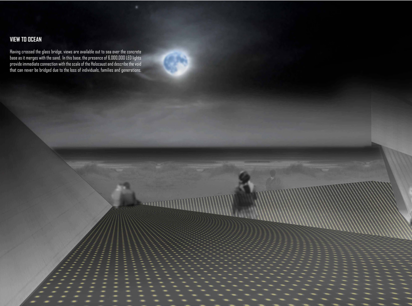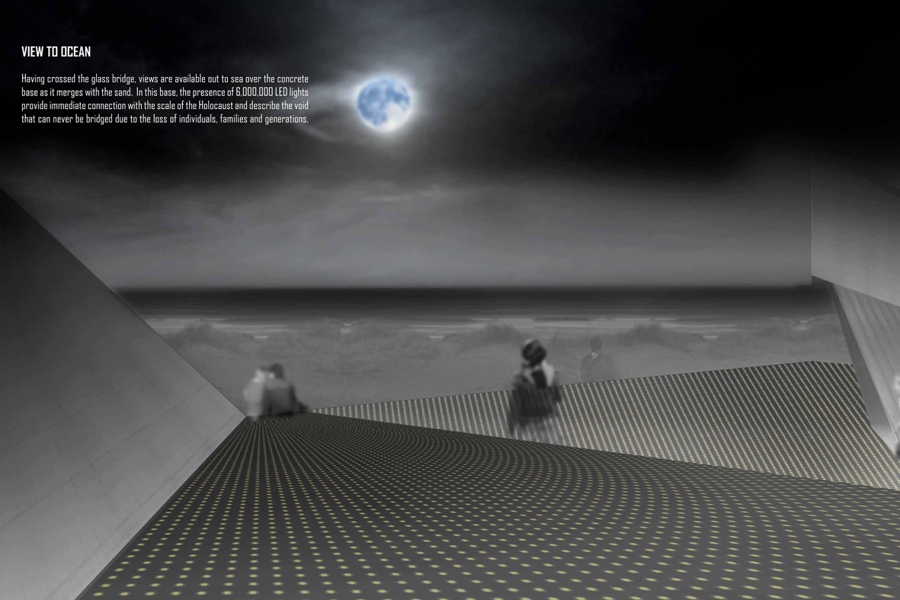 Having crossed the glass bridge, views are available out to sea over the concrete base as it merges with the sand. In this base, the presence of 6,000,000 LED lights provide immediate connection with the scale of the Holocaust and describe the void that can never be bridged due to the loss of individuals, families and generations.