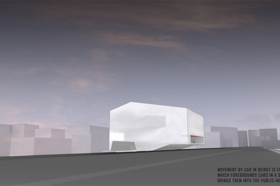Faced with a site lacking in a defined context beyond that of the freeway, this proposal foregrounds the freeway as the site itself. The building clips to the freeway, bringing it into the project while at the same time urbanising the road itself. The strong preference for movement by car in Beirut is encompassed in this strategy which foregrounds cars in a spatial sense and which also brings them into the public-ness of the project via the route for parking and circulation.