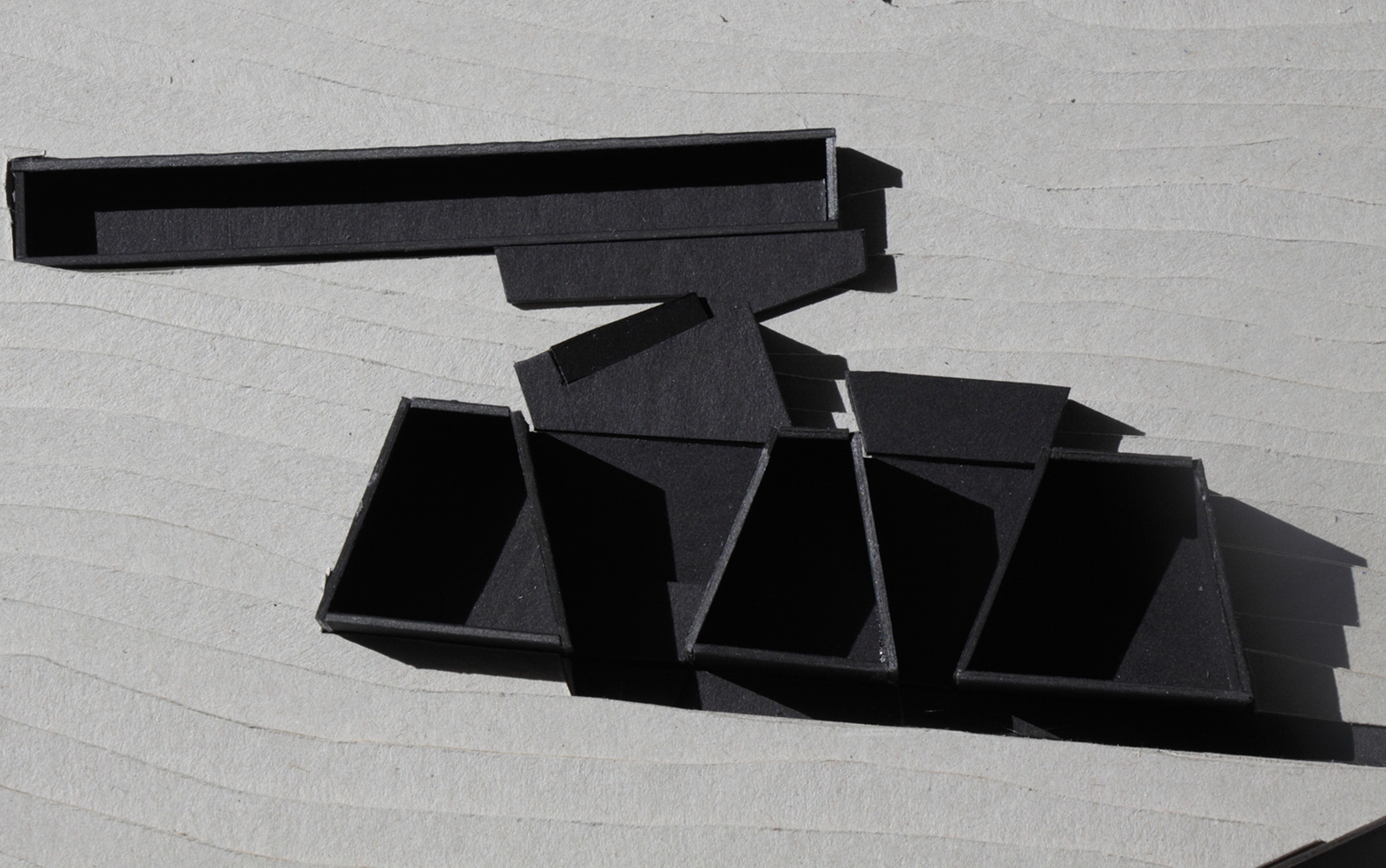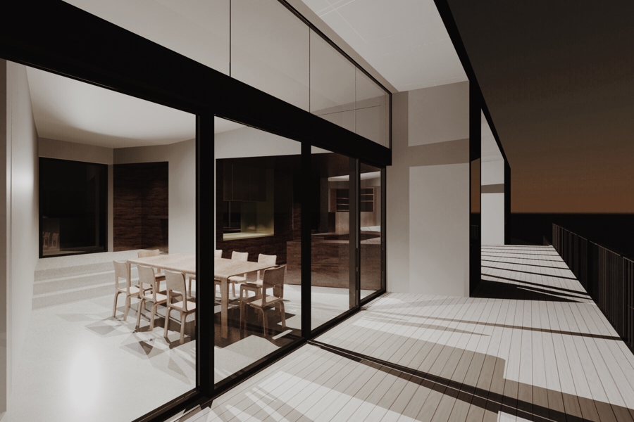 The plan of this house was generated by an organization of the client’s ideal living patterns in response to the sloping site and distant hill views available. The thin bar plan that resulted is more than an arrangement of rooms along a contour, but is instead structured around a series of served and servant spaces that open and close in response to the view. The availability of key views determined the location of major living and dining spaces that open out to and encompass the greater landscape while in between these “public” rooms, smaller private spaces are more internal in nature and have focused apertures to specific view corridors. This complex arrangement is sheathed in a simple dark container which addresses the economy required of the project and situated the house in the suite of “blunt objects” the practice has worked with previously.