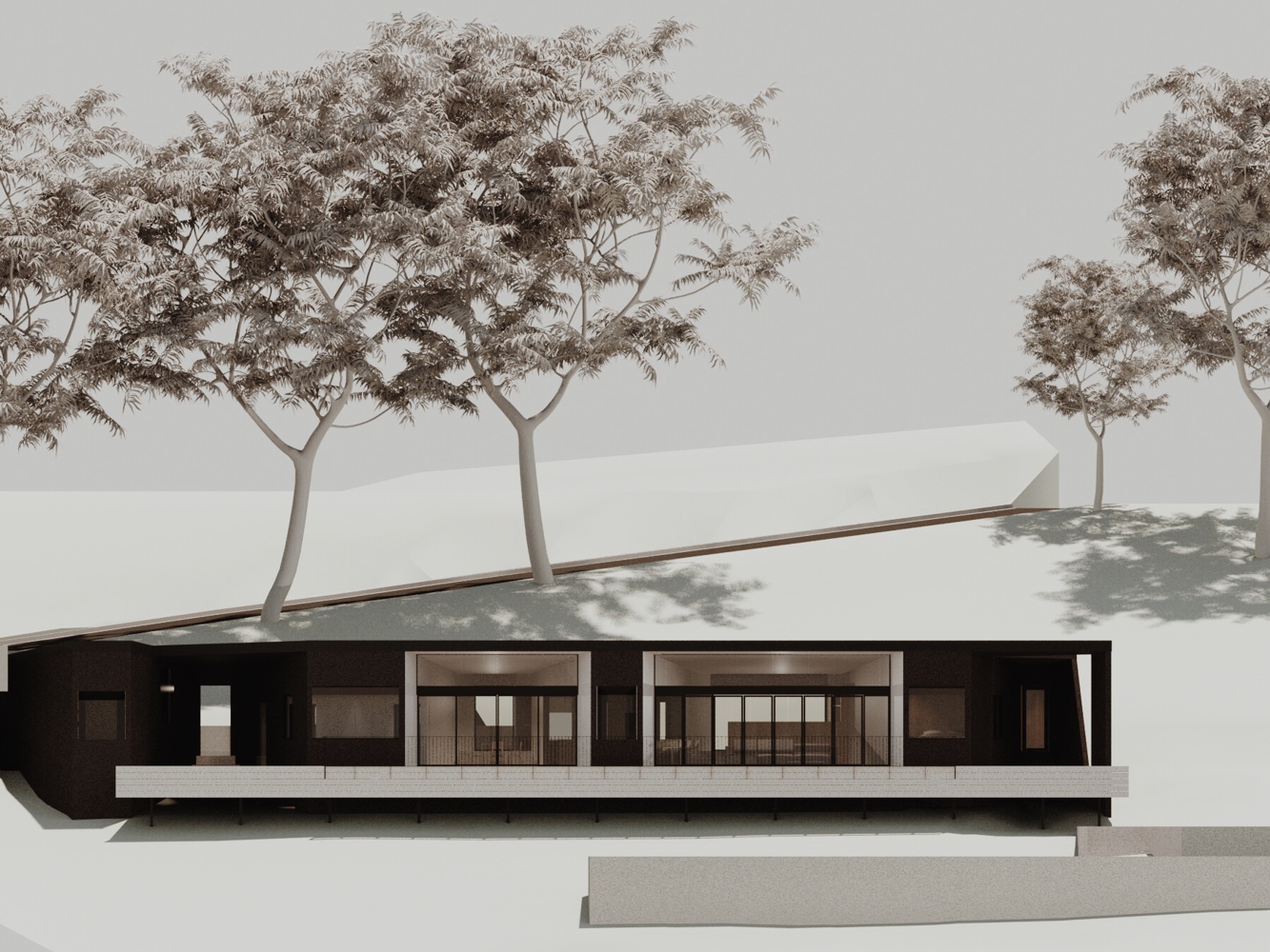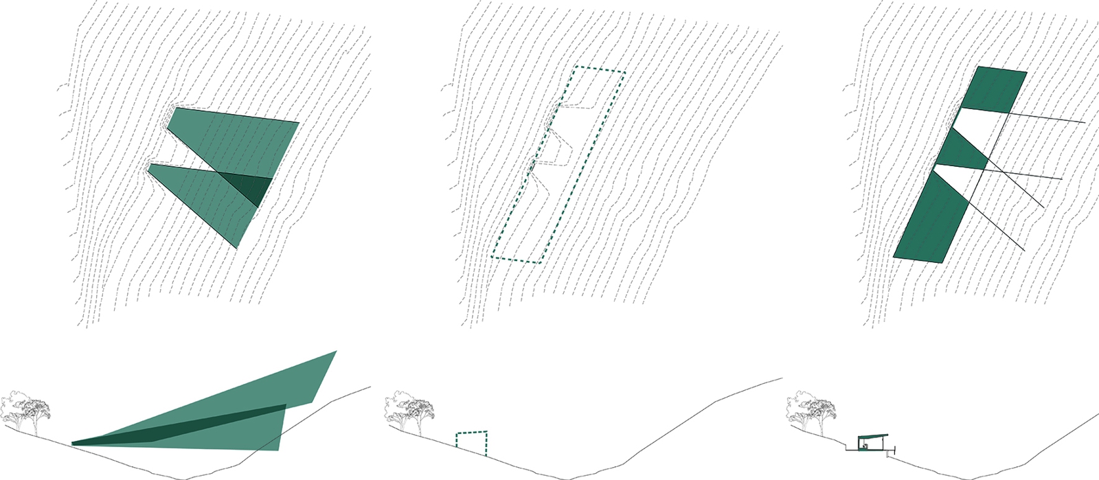 A series of adjustments are then made to the dark volume of the house – an opening to a bathing courtyard and another to a breakfast courtyard, and a third move in the form of an extended roof over the entry. Each of these moves lead to moments of intrigue in the way they break from the standard volume, focusing the occupants on those moments in the experience of the house. Two additions, in the form of a car platform and pool, augment the simple black bar and form a threshold between it and the sloping landscape.