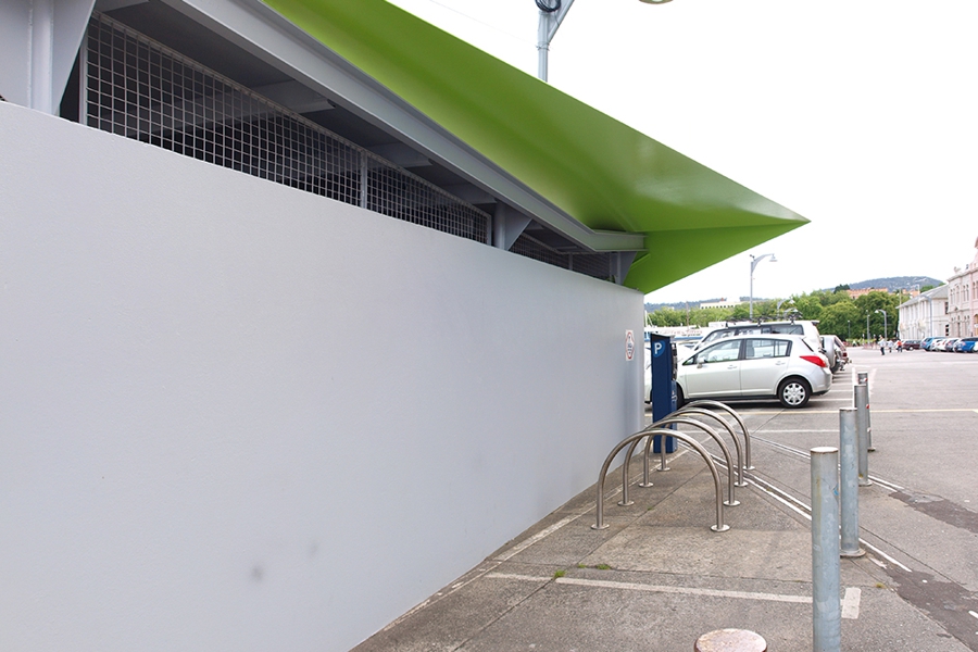 An identifiably new folded steel element painted in an identifiably Tasmanian green colour was placed over the existing building to provide a new identity to the mundane services enclosure with relatively minimal means.