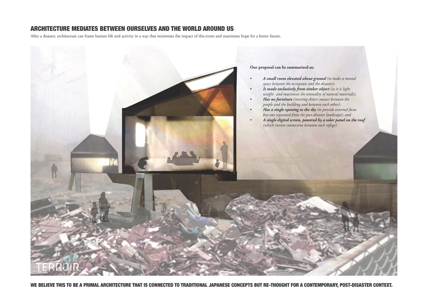 Our image is based in the idea that architecture mediates between ourselves and the world around us. After a disaster, architecture can frame human life and activity in a way that minimises the impact of this event and maximises hope for a better future.