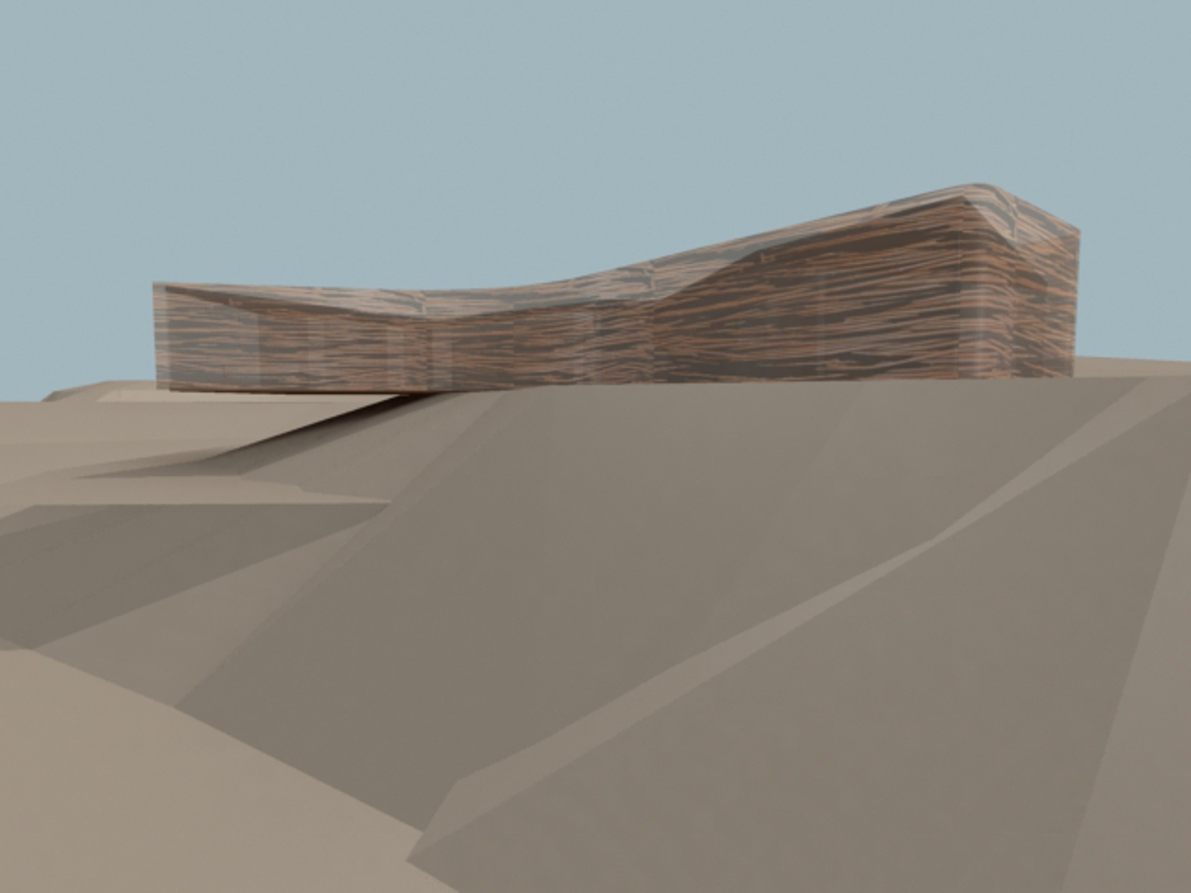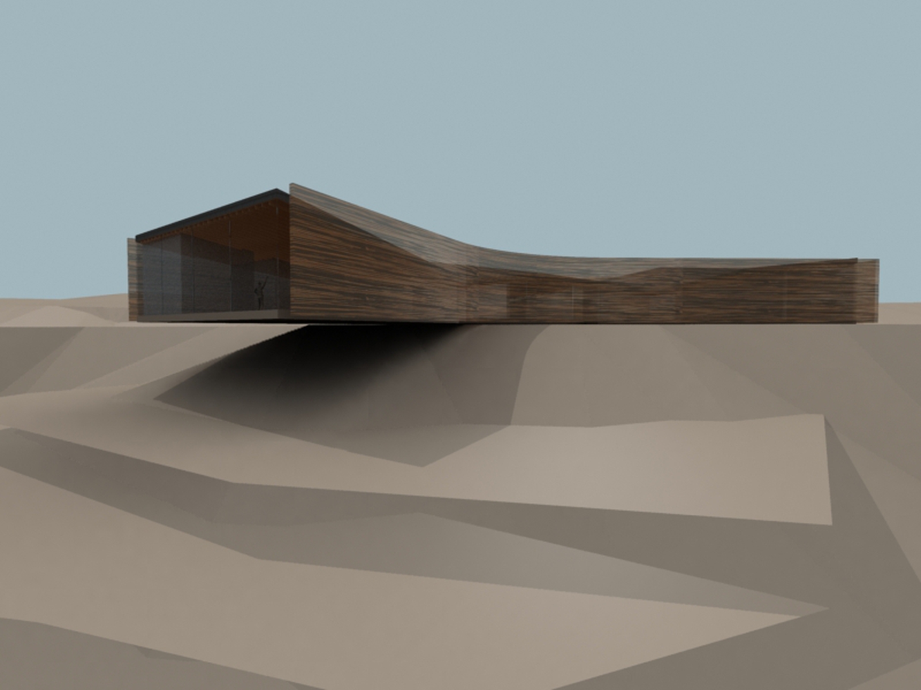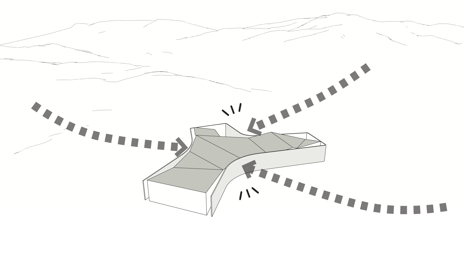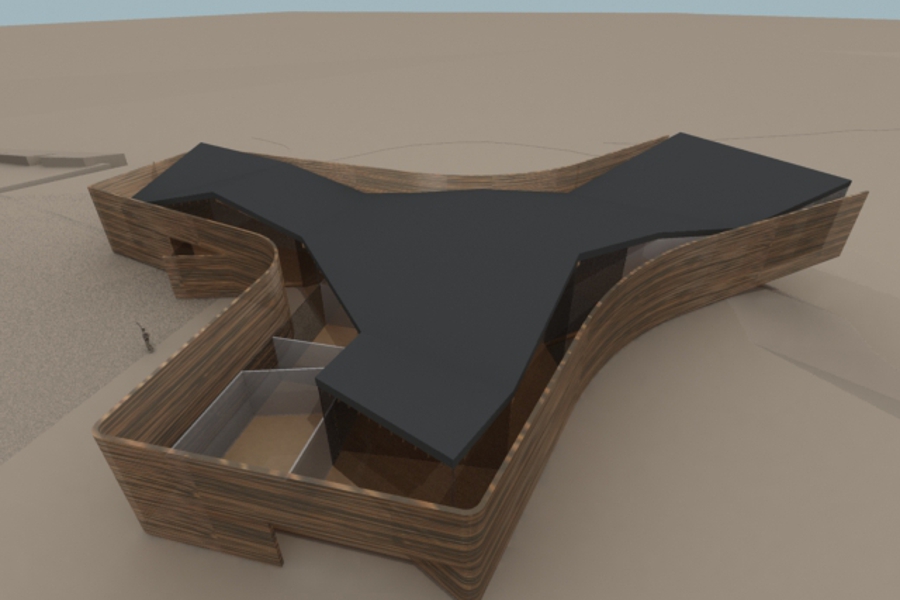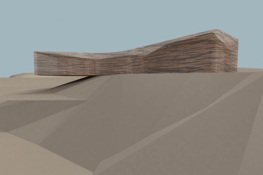 The physicality of the landscape itself has also impacted on the Pavilion form. The profile of the surrounding hillsides has seemingly been exaggerated to effect the shape of the Pavillion – pushing in on three sides to form the unique tri-winged shape. Each wing thus corresponds to specific site circumstance: visitors will enter through one wing which is a natural extension of the access road already up on to site; while the main cantilevered wing provides a frontal relationship to the valley view to the Great Wall; and finally the remaining wing kicks around to enable visitors to look down the river valley.