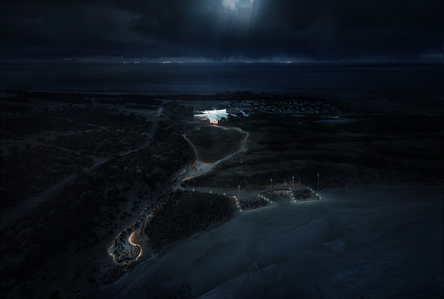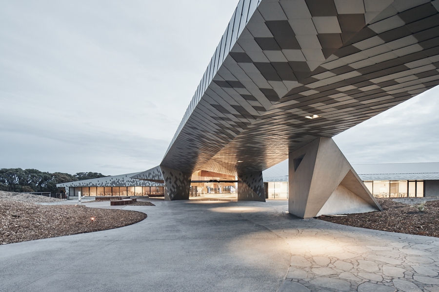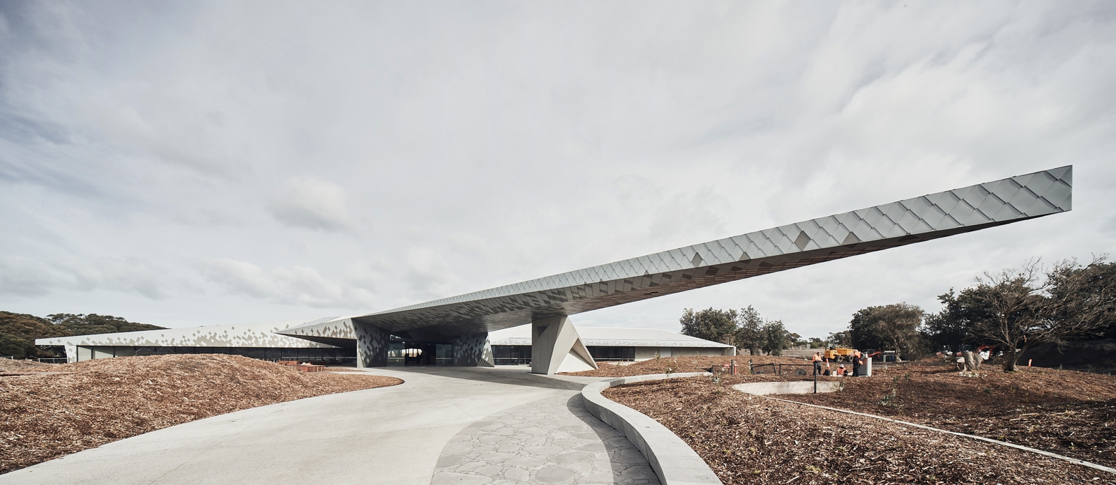 The new Visitor Centre for the Penguin Parade carries the ambitions of this tourism and conservation program across iconographic, experiential and functional contexts. The building sits at the nexus between 3 landscapes: dunes, headland and wetland, linking these landscapes like a brooch that gathers these together and responds to each in specific ways – formally and experientially. The power of the three landscapes is acknowledged in the homogenous zinc cladding to the building that increases its abstraction while providing a constant against which the three landscapes are registered.