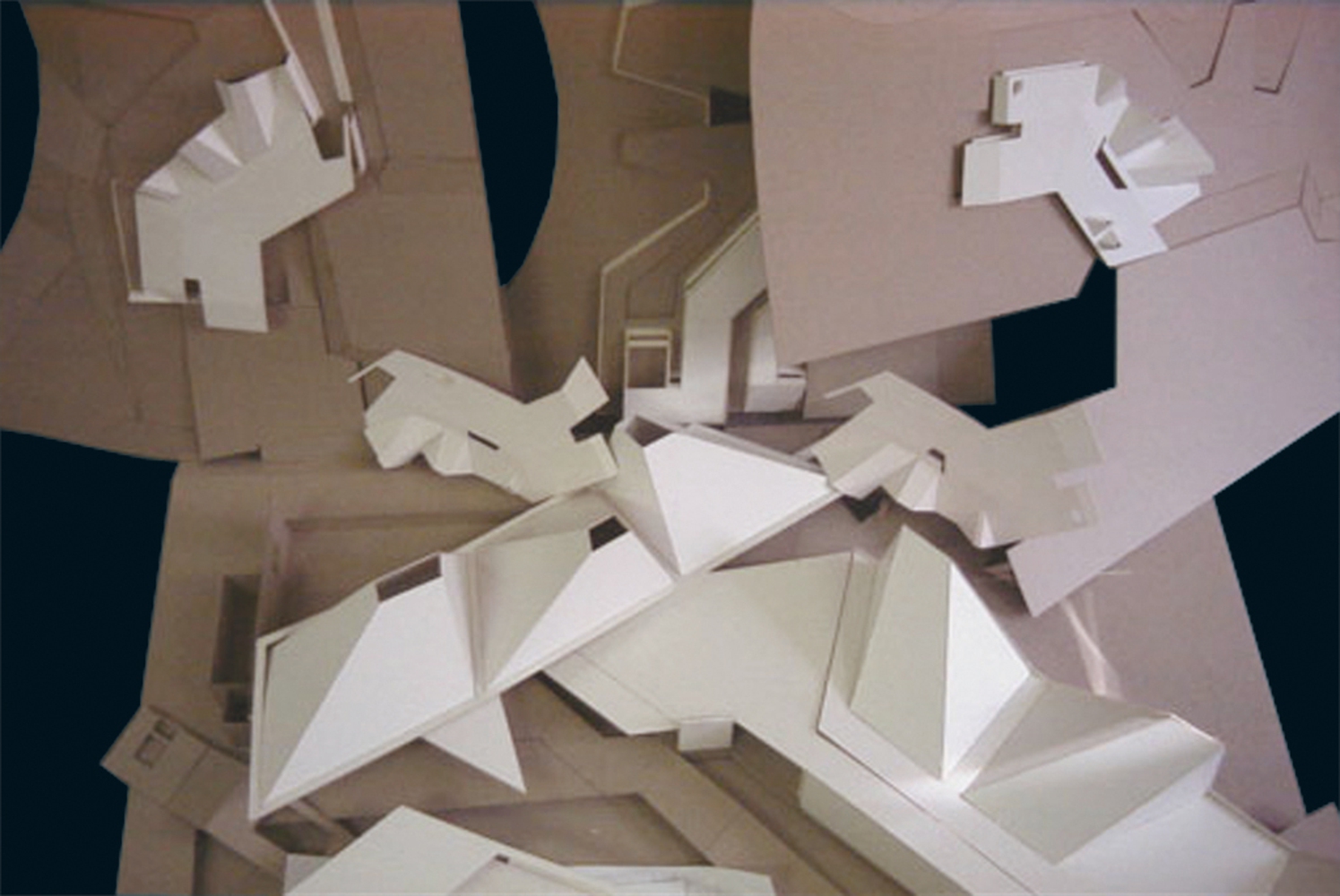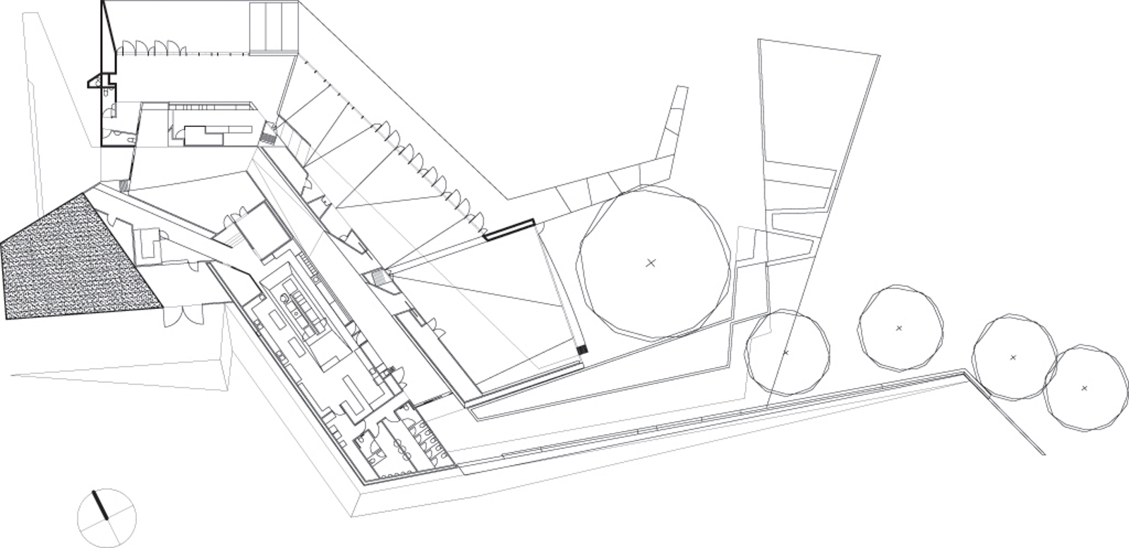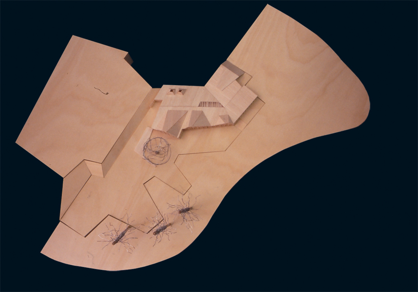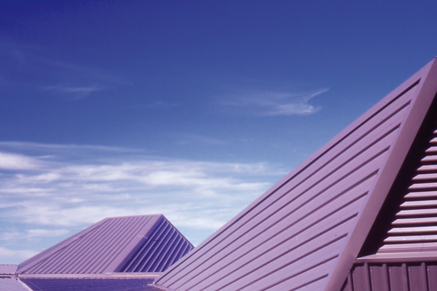 A grey metal landscape results from the gathering of all roof and wall elements, exhausts, and entry and exit sequences into a single folded plate. This landscape contrasts with the lush interior - recalling the interplay of inner and outer as explored in the work of Parent and Virilio and later Nouvel. At a pragmatic level, this strategy resolved issues of building a cheap building - a "zippered up" exterior using traditional shed materials and a more luxuriant yet restrained interior where the detailing could be more exploratory and invited less risk.