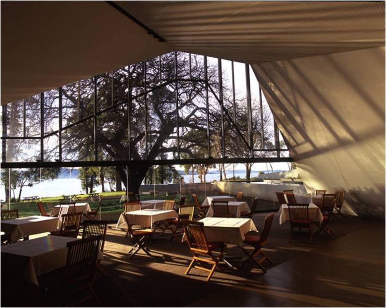 An elongated entry space connecting carpark and garden commences the on-site journey. Glimpses are provided to the kitchen, bar and restaurant spaces beyond. One side of the path is described by a timber container harbouring entry points to the public areas and which provides for a series of poche spaces for service areas and stores. The public spaces beyond the wall are divided into three zones, each of which has a precise and different relationship to the landscape.