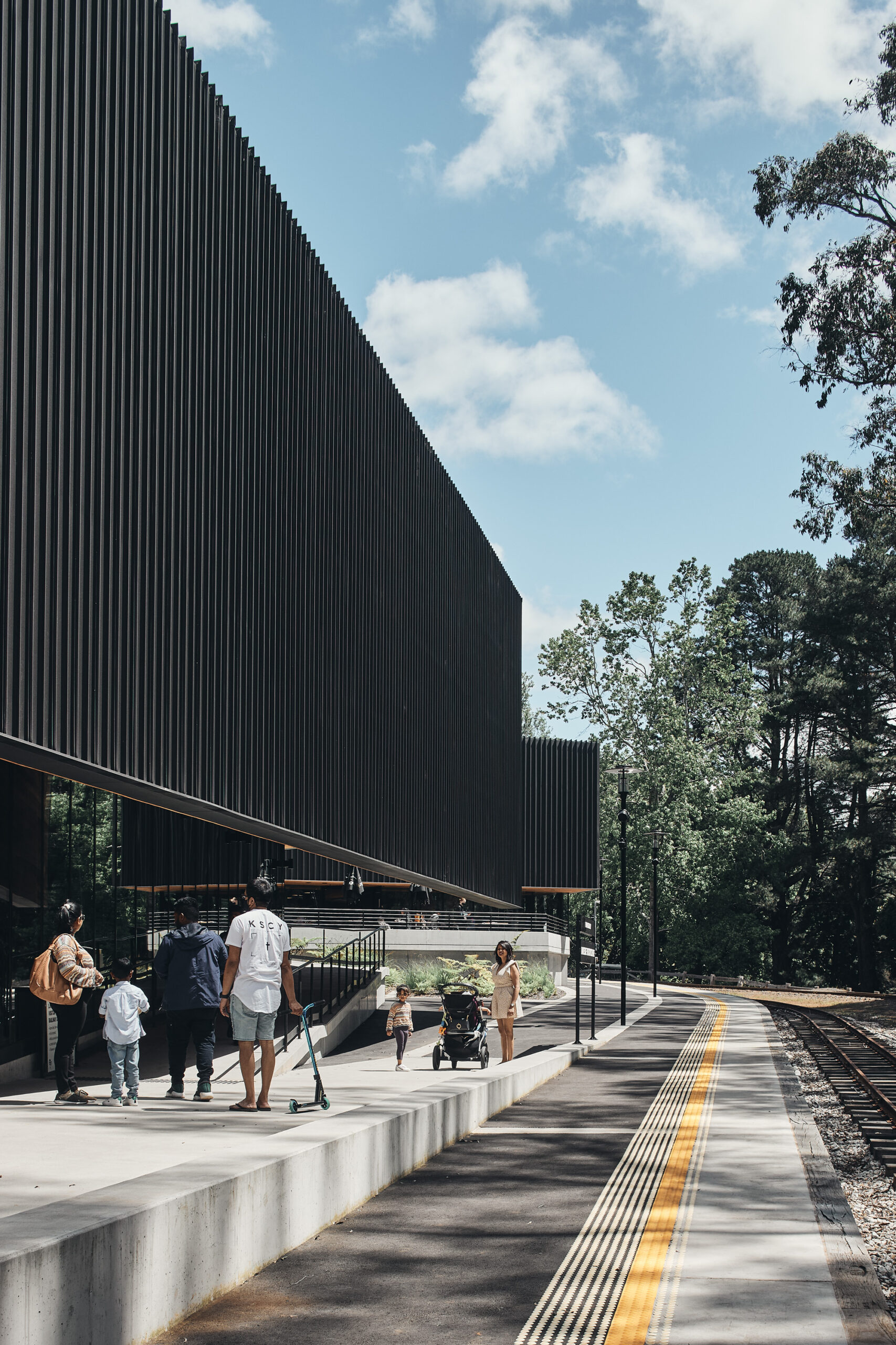 Meandering journey The platform is manipulated to preserve significant trees that are critical of the identity of the bush setting, whilst providing enhanced spaces track side and views over Puffing Billy Railway trains, people and activity, and beyond to Emerald Lake. Embodying the meandering rail route through the landscape, the visitors journey is nuanced around the bush landscape.