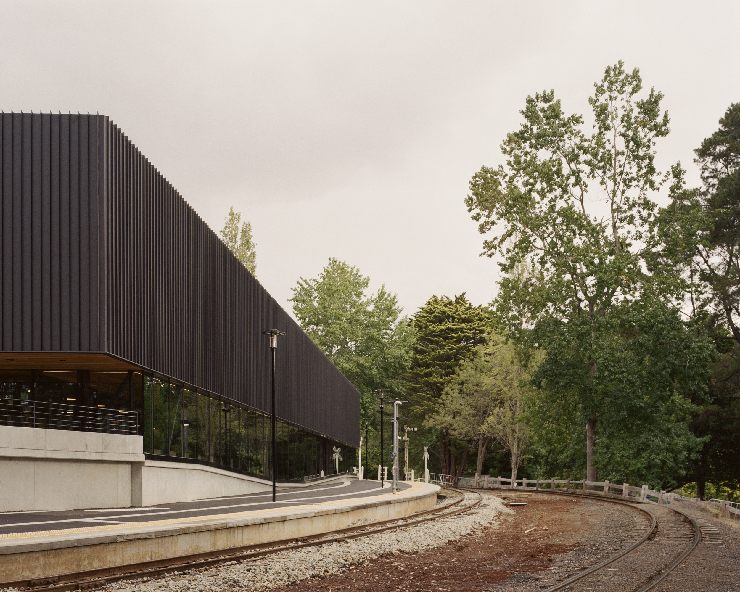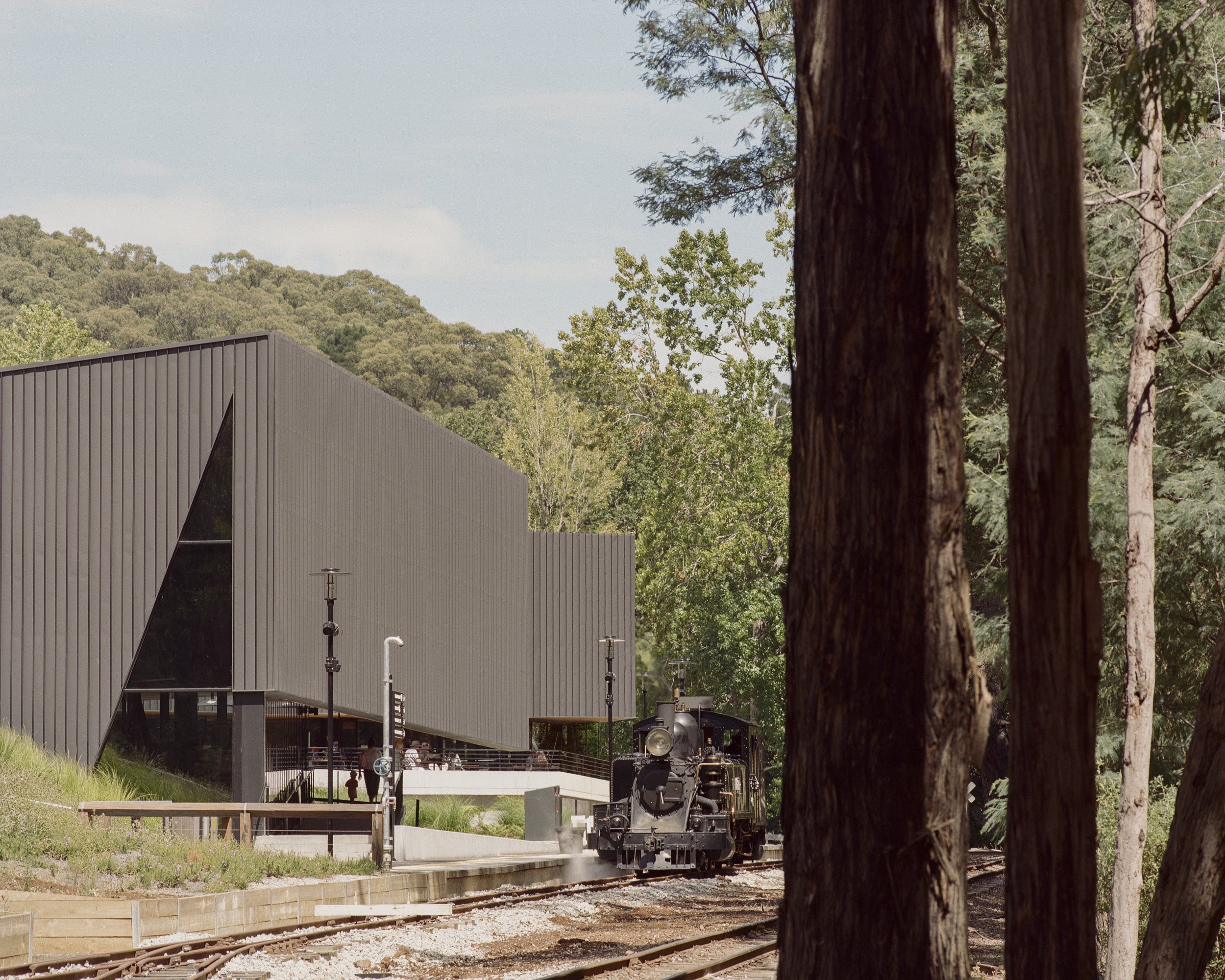 Our strategy was not to focus on building a “novel” visitor centre as a new attraction, but rather focus on the existing railway line and platform – creating a visitor experience anchored within the authentic sights, smells and sounds of the railway. We also responded specifically to the two unique landscape contexts, working with our landscape team at Tract Consulting to stitch together the bushland uphill of the project and the contrasting European park landscape in front.