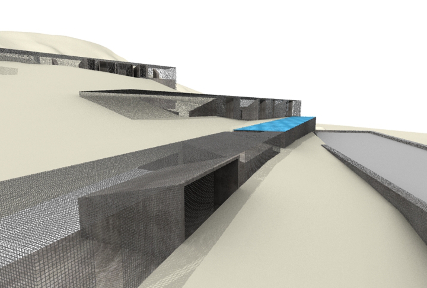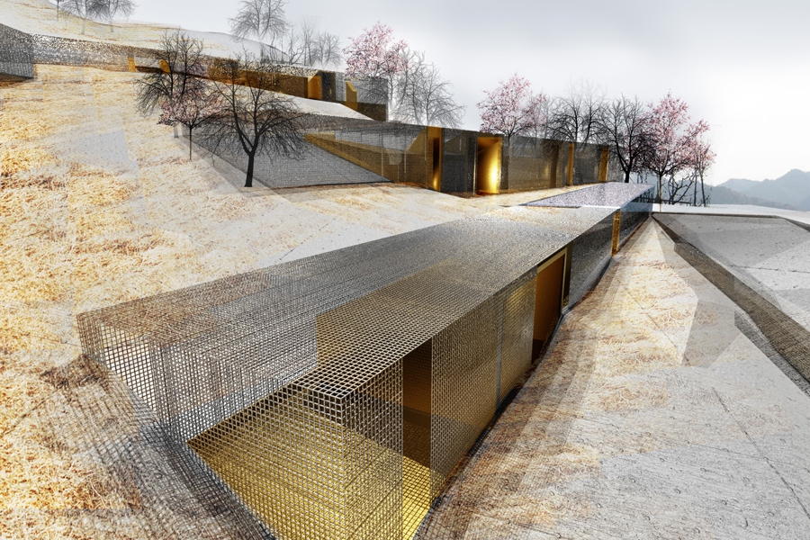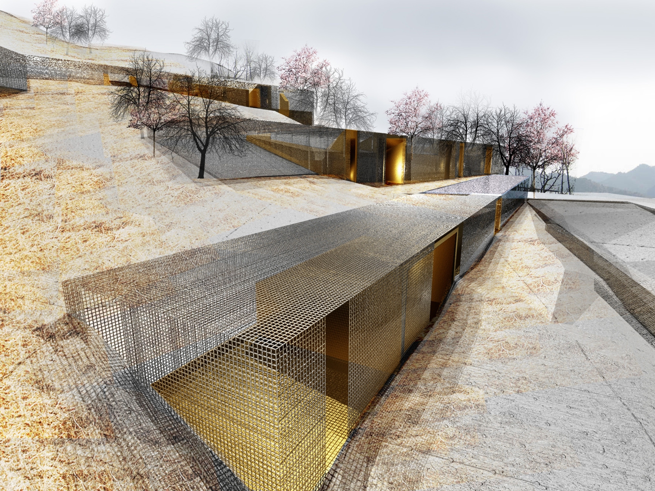 The valley leading up to the Huangya Gate of the Great Wall is a dramatic, powerful landscape, with steep mountainous terrain rising on either side of the meandering Ju River. The Winery site occupies a portion of the overall valley region and within its subtlety and sensitivity should project itself conceptually to be an integral part of the entire resort area comprising in excess of 200 square kilometres. The commanding, linear forms of the proposal slide out from the hillside as though they have seemingly been “revealed” rather than placed on to the site. Its intended that this new building is seen as part of the ground and infact part of the powerful landscape in which it occupies.