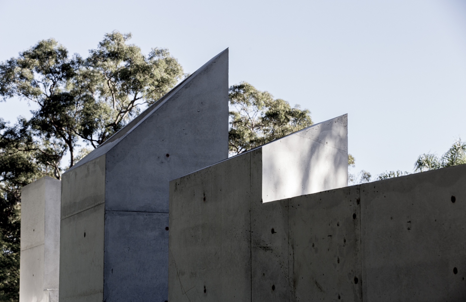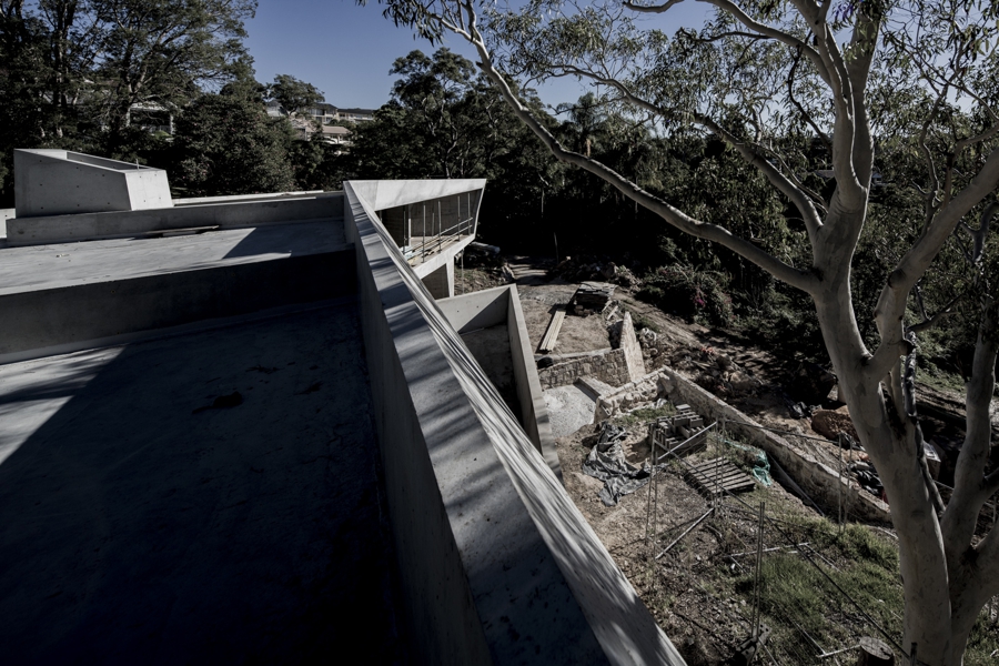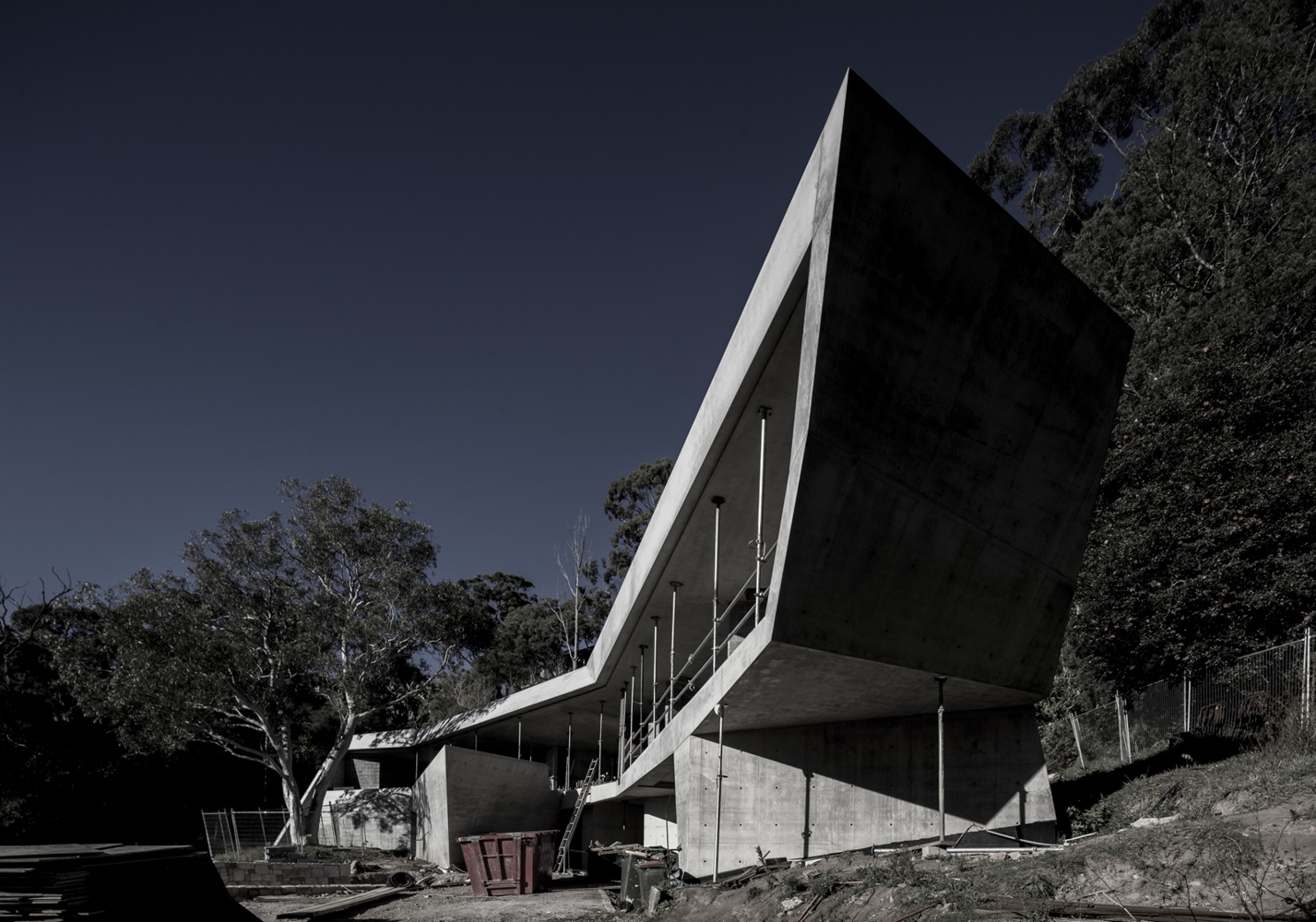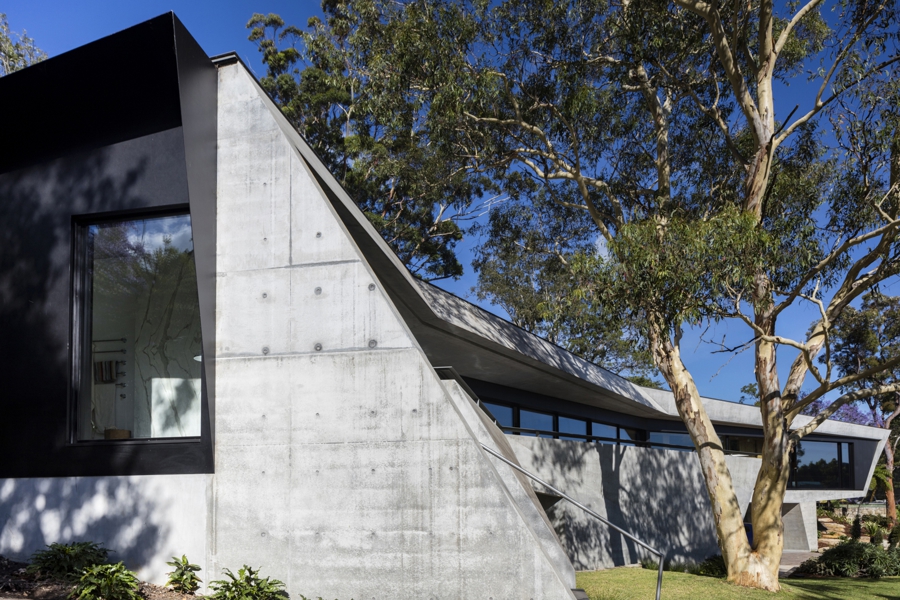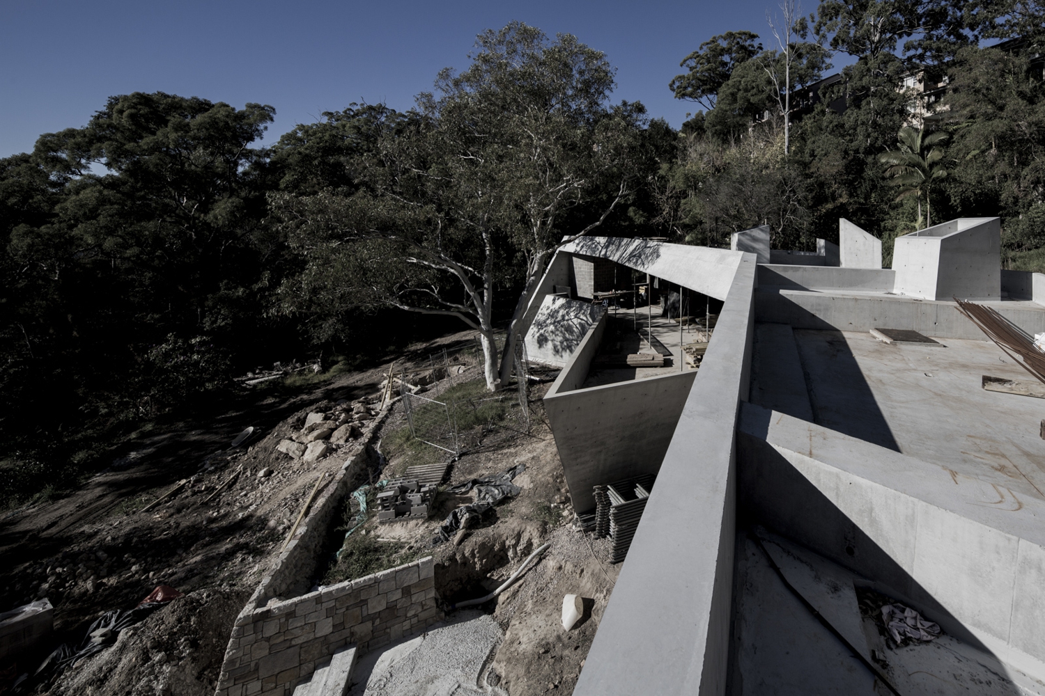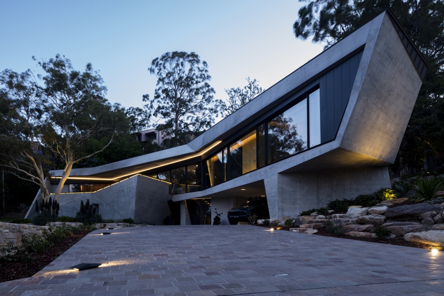 This project is sited in one of these classic Sydney contexts, Castle Cove, where steep, angophora-lined ravines contain tributaries that down to the harbour. The sandstone geology is omnipresent and takes many forms, from mighty escarpments to minor ripples in the bedrock. These landscape tectonics inform the design, where a concrete shell of irregular geometry steps around outcrops and contours, creating an indeterminate form that is distinctively new but also could equally be a strange object ‘unearthed’ in excavation. Either way, the concrete element is reverberates with the site geometry while forming a built escarpment that provides a plateau for habitation. The concrete escarpment is roofed in a continuous zinc membrane that folds over to form a smaller pocket to the rear containing private rooms. Both materials will patinate over time, moving again from a “new” to “pre-existing” form.