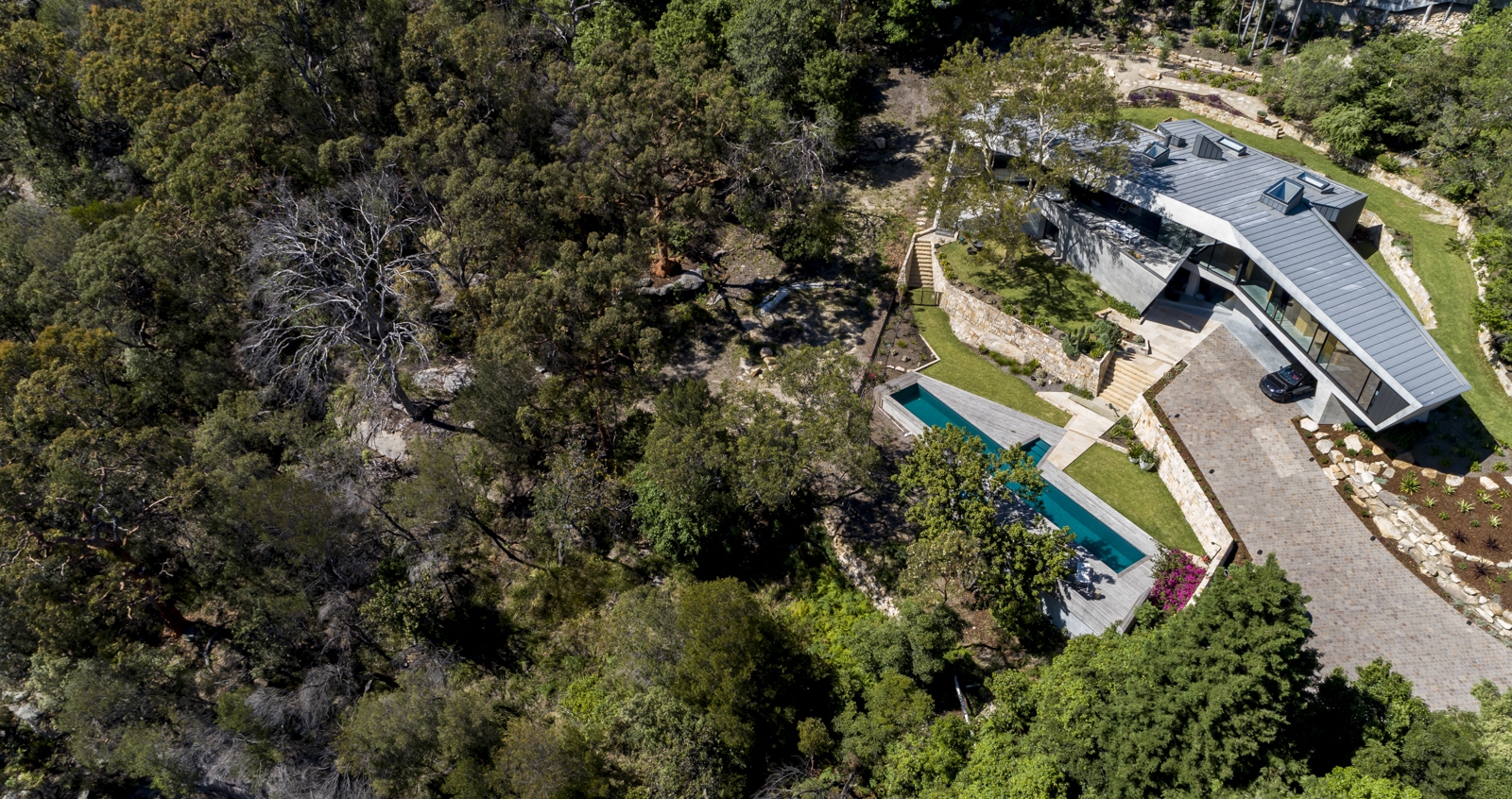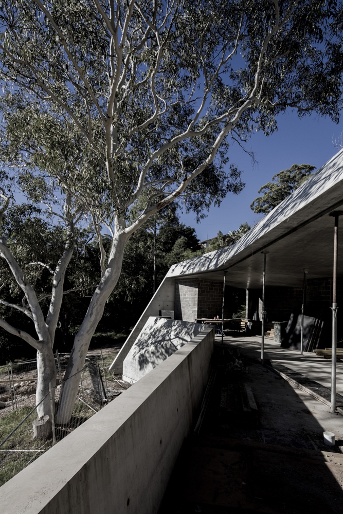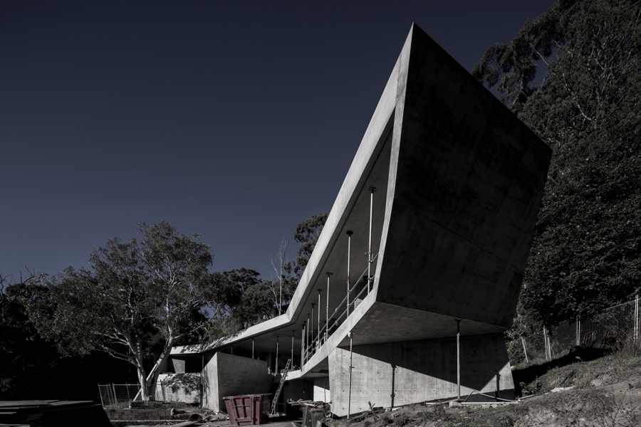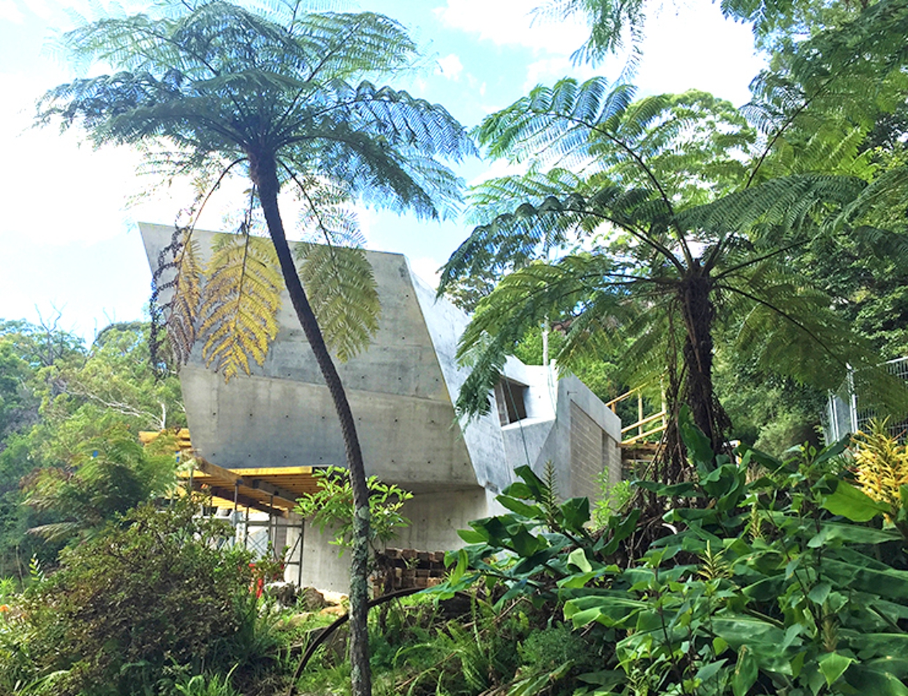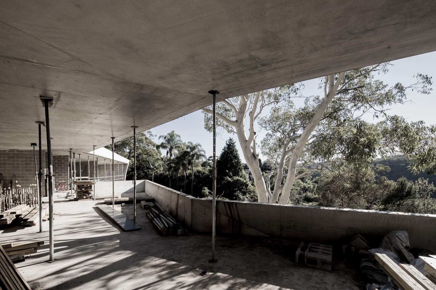 This project is sited in one of these classic Sydney contexts, Castle Cove, where steep, angophora-lined ravines contain tributaries that down to the harbour. The sandstone geology is omnipresent and takes many forms, from mighty escarpments to minor ripples in the bedrock. These landscape tectonics inform the design, where a concrete shell of irregular geometry steps around outcrops and contours, creating an indeterminate form that is distinctively new but also could equally be a strange object ‘unearthed’ in excavation. Either way, the concrete element is reverberates with the site geometry while forming a built escarpment that provides a plateau for habitation. The concrete escarpment is roofed in a continuous zinc membrane that folds over to form a smaller pocket to the rear containing private rooms. Both materials will patinate over time, moving again from a “new” to “pre-existing” form.