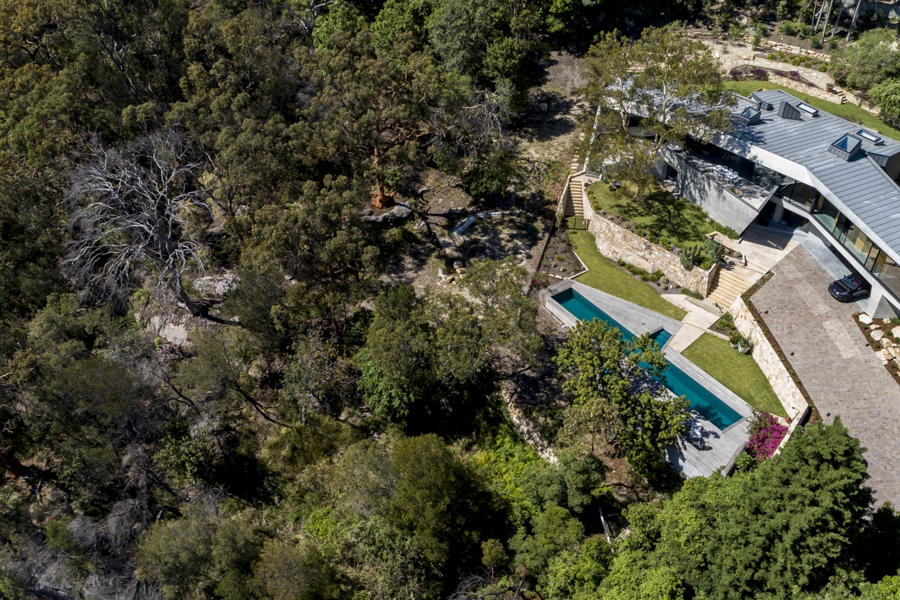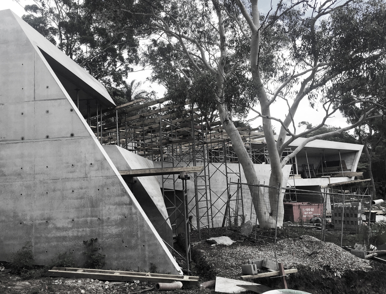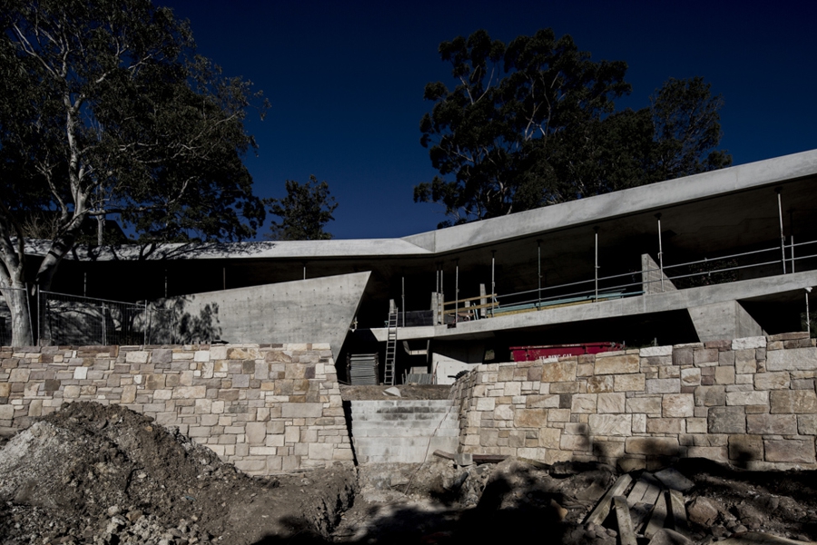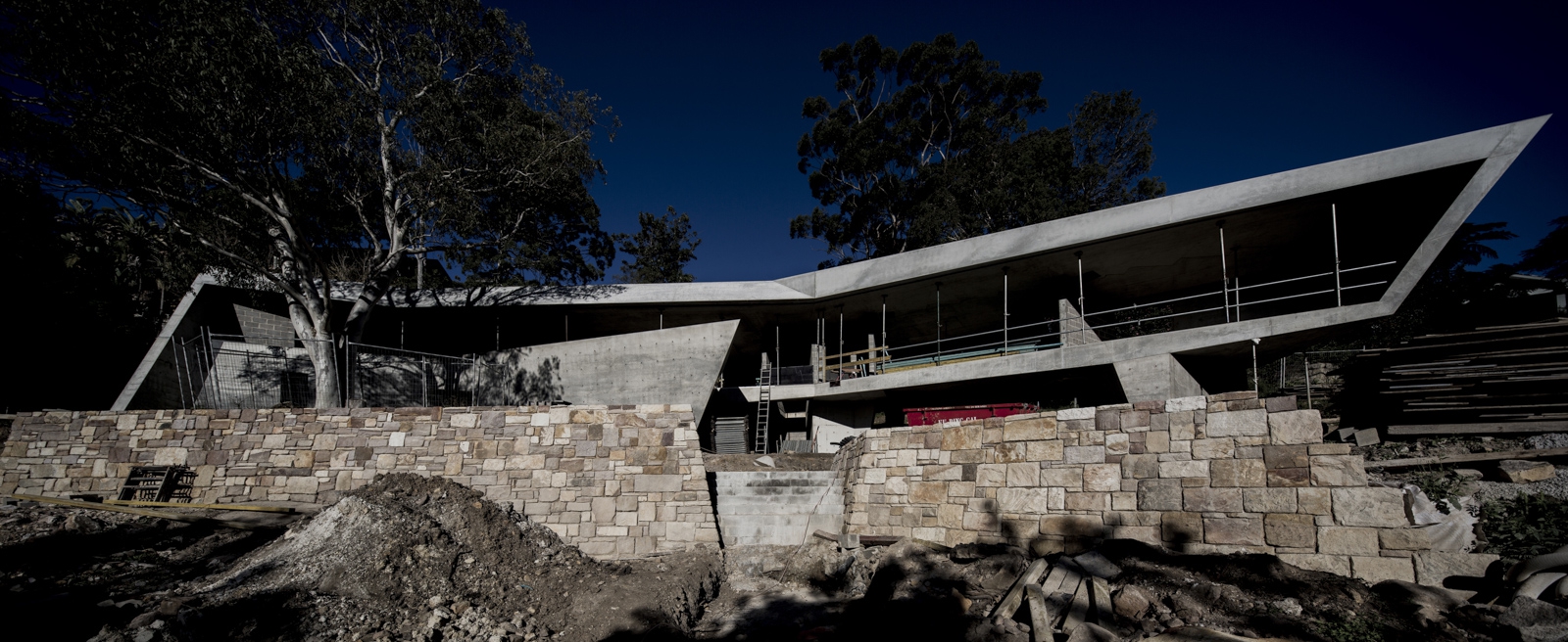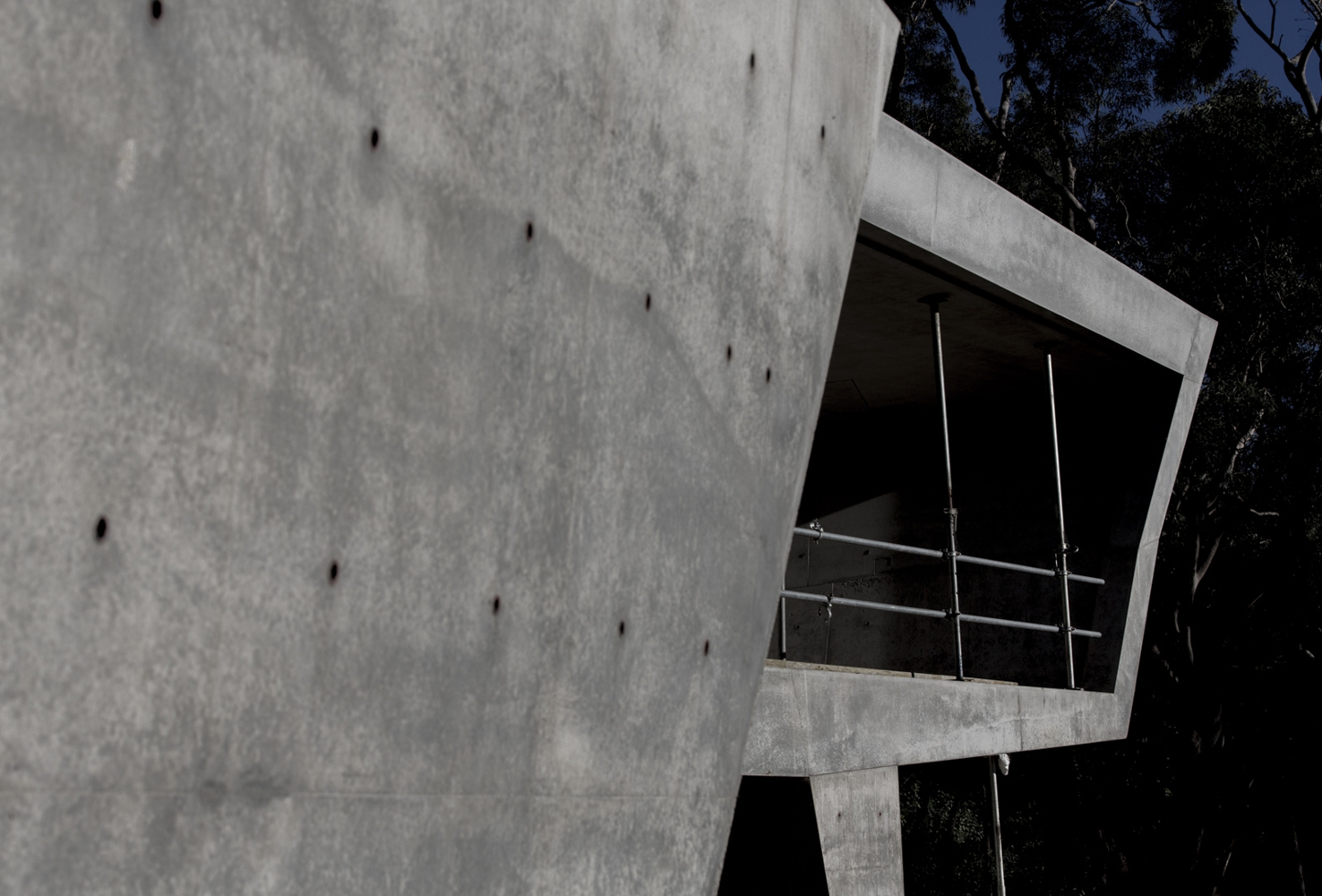 This project is sited in one of these classic Sydney contexts, Castle Cove, where steep, angophora-lined ravines contain tributaries that down to the harbour. The sandstone geology is omnipresent and takes many forms, from mighty escarpments to minor ripples in the bedrock. These landscape tectonics inform the design, where a concrete shell of irregular geometry steps around outcrops and contours, creating an indeterminate form that is distinctively new but also could equally be a strange object ‘unearthed’ in excavation. Either way, the concrete element is reverberates with the site geometry while forming a built escarpment that provides a plateau for habitation. The concrete escarpment is roofed in a continuous zinc membrane that folds over to form a smaller pocket to the rear containing private rooms. Both materials will patinate over time, moving again from a “new” to “pre-existing” form.