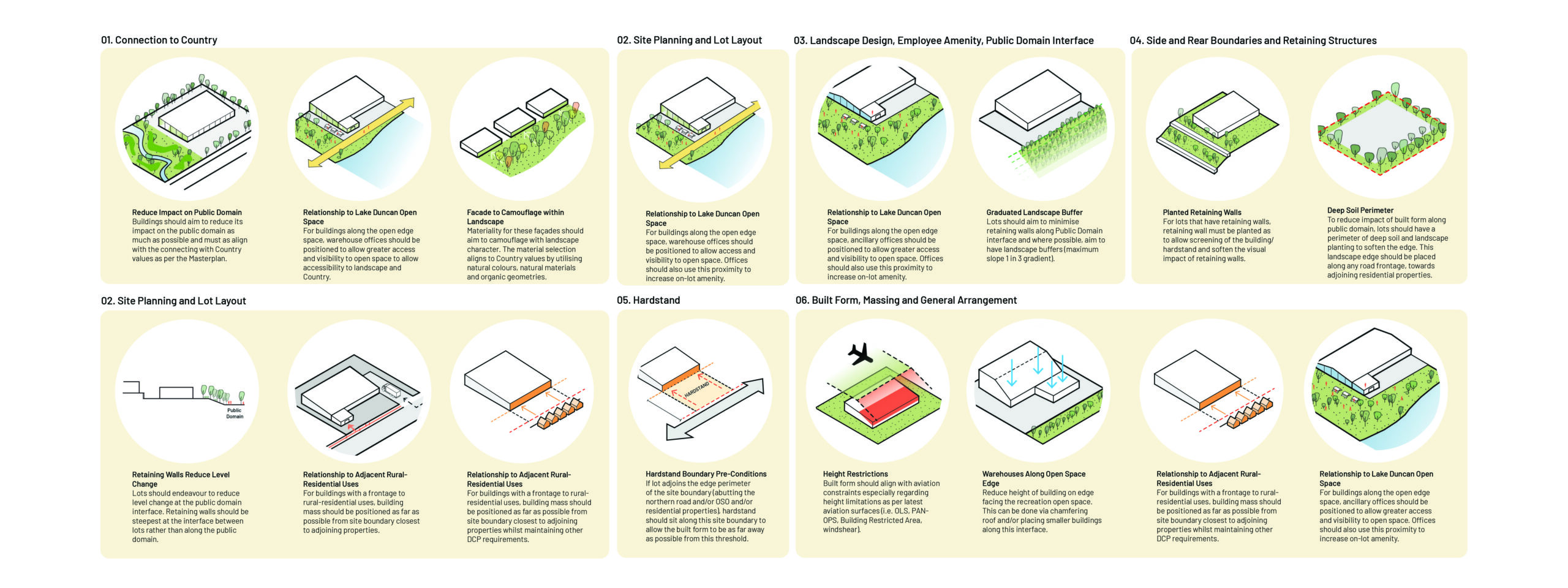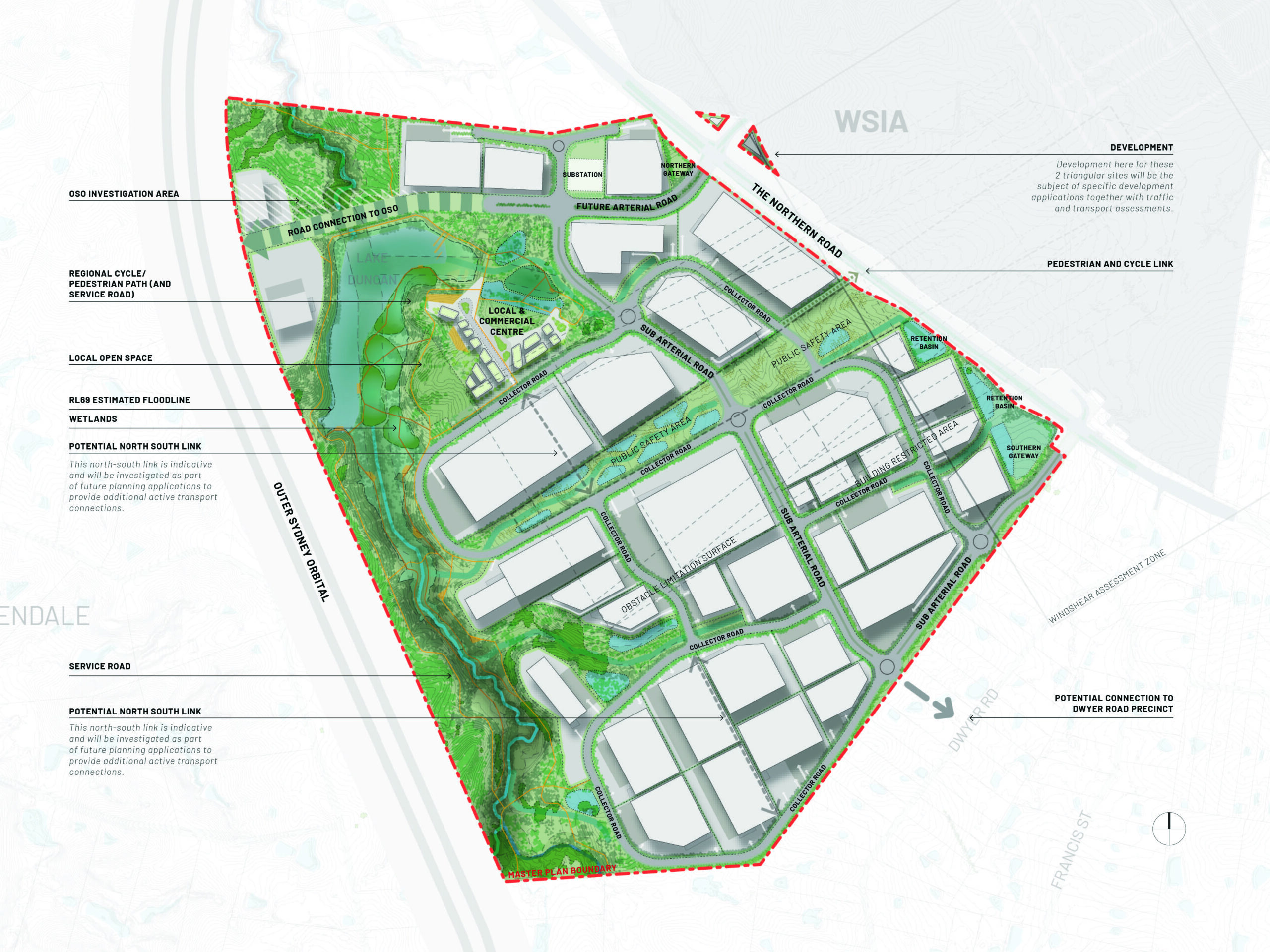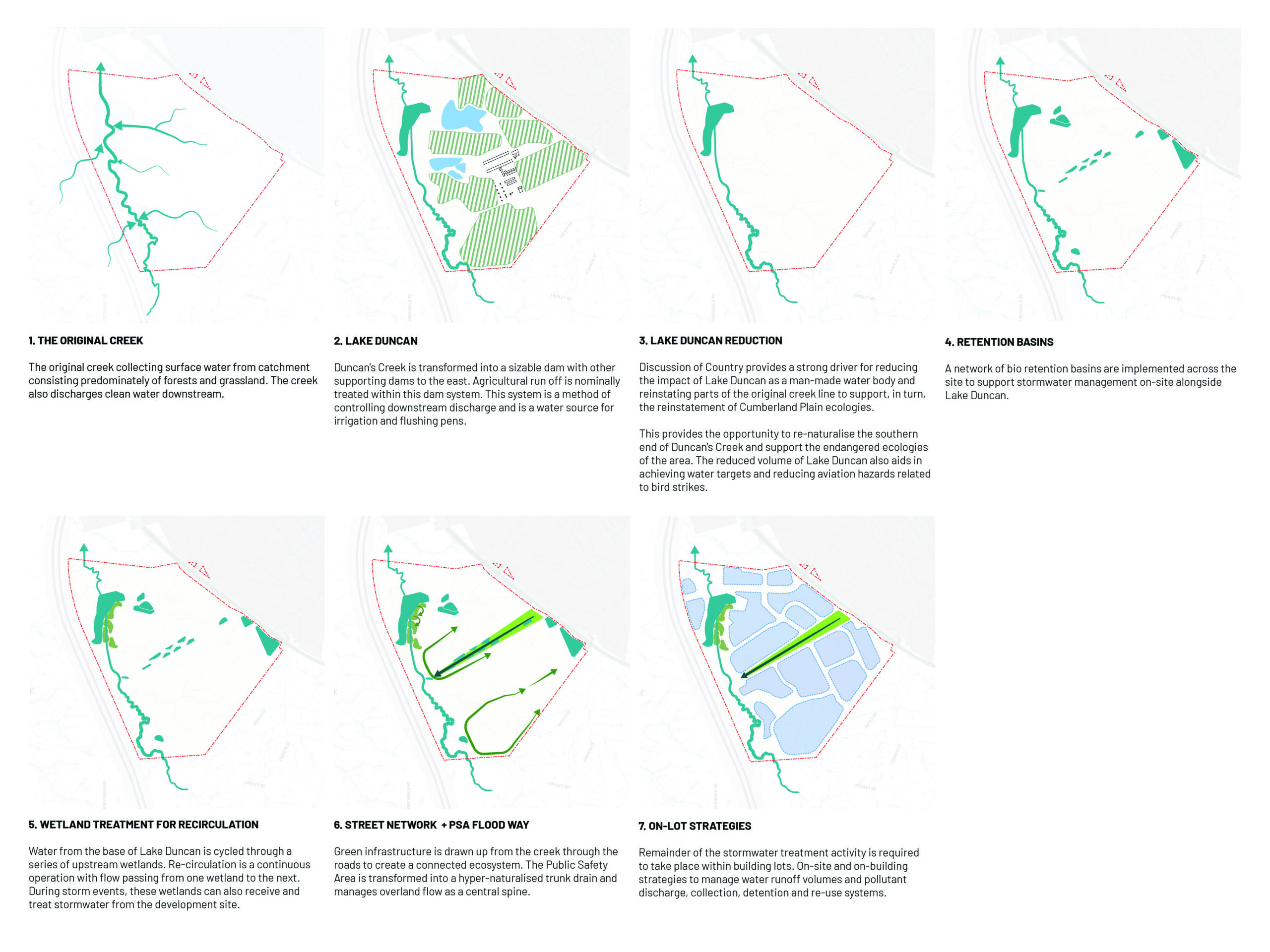 Recovering and restoring the previous creeks on site and associated riparian zones, water is the driving force shaping the approach to the site, creating lush, cooling landscapes to ameliorate increasing heat stress, supported by re-vegetation corridors in riparian zones, along roads and within developable lots and the public domain. The water system is intertwined with a connectivity network – roads, paths and cycleways – which enables the movement of goods around and out of the site while prioritising pedestrian comfort and safety. Around the Lake itself a local centre provides a space both for workers and visitors but also a broader cohort who will be drawn by the largest water body in this part of Sydney as place for recreation and for connecting with Indigenous landscape knowledge.