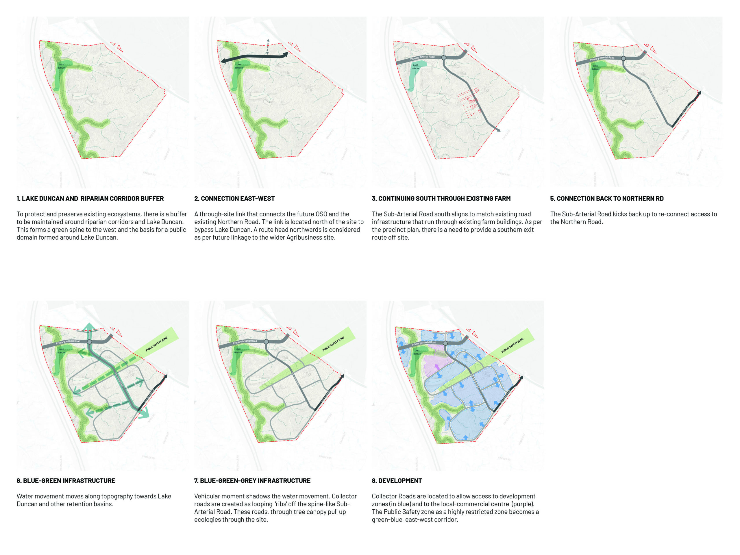 Lake Duncan forms the backbone for the site as a key stormwater asset for amenity, stormwater management, stream health and stormwater harvesting. Water flow and collection in Lake Duncan forms divisions on the site that can determine locations of road, public space and development.