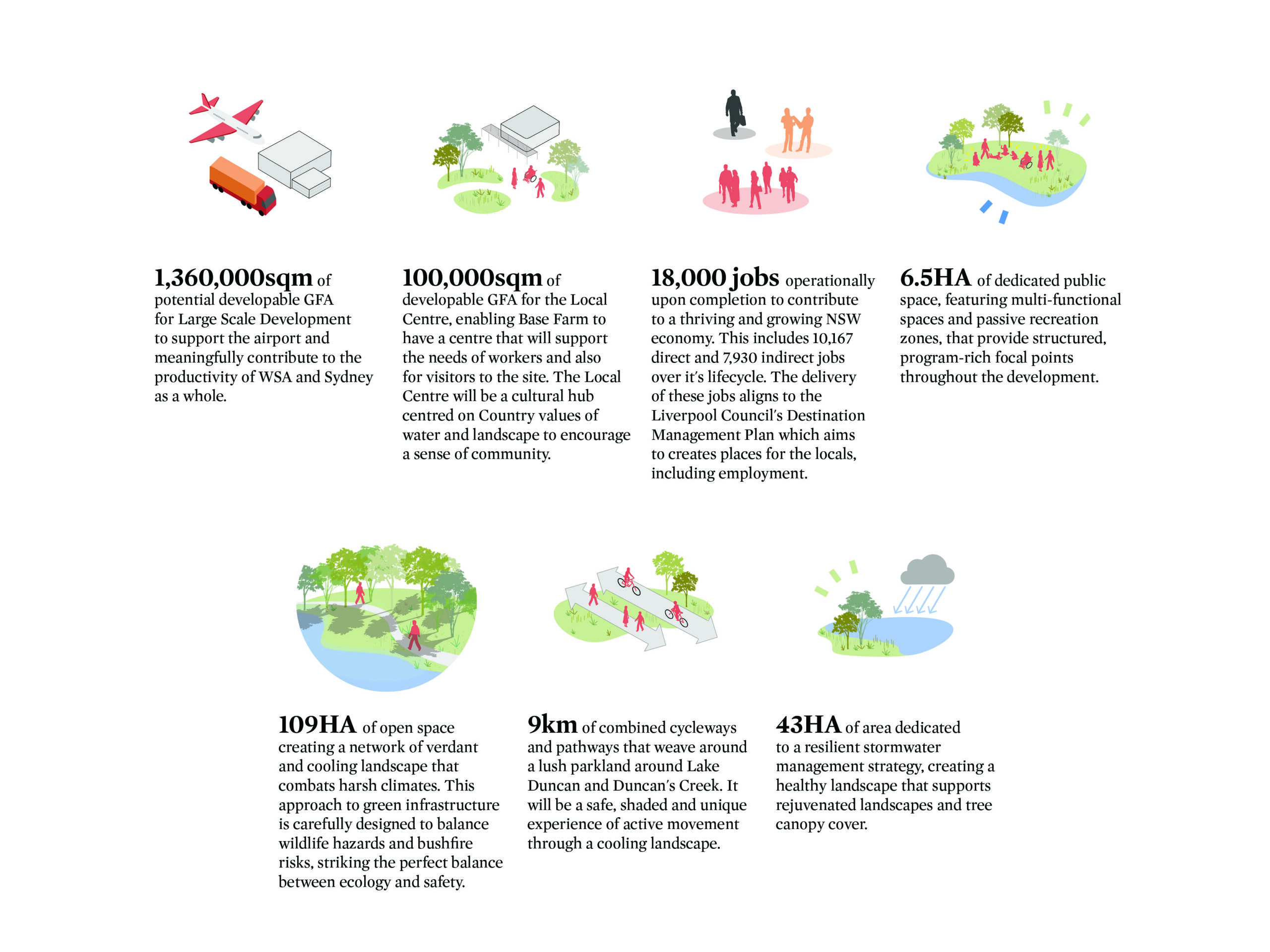 Base Farm is a huge 520-hectare single landholding located immediately adjacent to the new Western Sydney International Airport. The scale of the site and its strategic location can enable a nationally significant, best practice development that fosters productivity, supports airport operations and provides a place for community recreation.