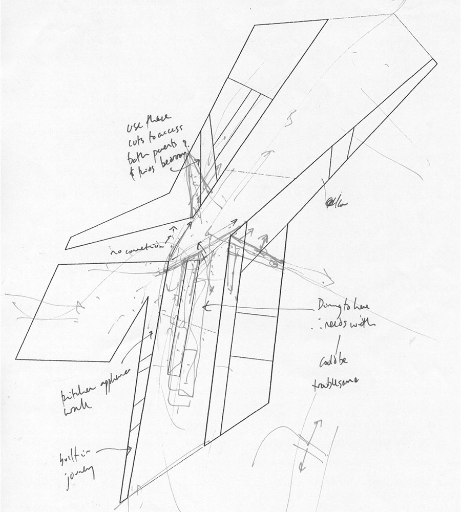 Occupying the end of a “line” – manifest in the drive from the city of Hobart up Mount Wellington to this foothill escarpment – from where primary water views to the south are experienced remained a strong conceptual driver, a carry-over from Fern Tree House 1. This iteration of the project however brought with it a re-awakening of the potent connection through the landscape on offer; between the summit of Mount Wellington and southern water views. Eschewing any notion of “line” as physical trace only – this underpinned the original Fern Tree House 1 – the project developed as a desire to capture the moment of “fusing” a trajectory of personal arrival with that of a latent landscape connection from the mountain pinnacle, and jointly projecting out to the southern view from the escarpment.