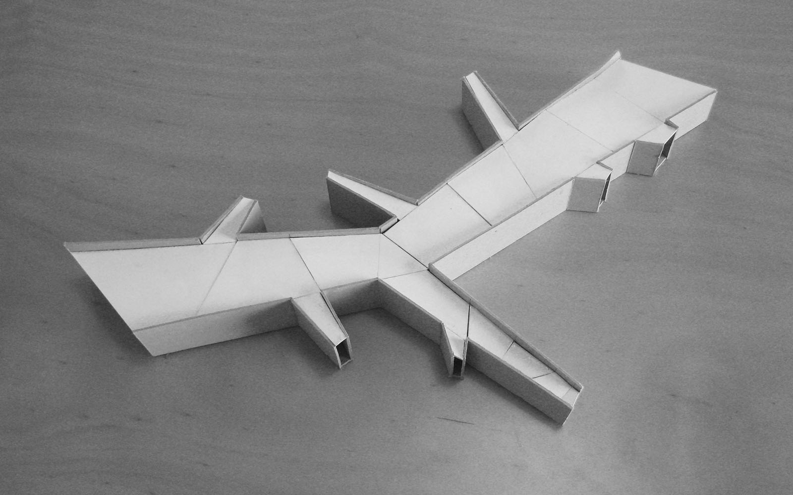 The blankness of the exterior is continued internally in the “public” spaces, furthering the idea of an uncanny container-like object in lieu of any semblance towards the “domestic”. The interior is in fact another exterior and equally “blunt” albeit the external tough metal cladding is replaced with a homogeneous ‘white’ surface. A crumpled ceiling expresses the force of the real (human arrival) and unreal (latent landscape line between mountain and view) vectors pushing in through the container-like internal space and fusing in to a singular projection to the distant water view; the ceiling profile relaxes as it approaches the culminating end space from where the views are experienced, similar to the effect of smoke travelling through a wind tunnel.