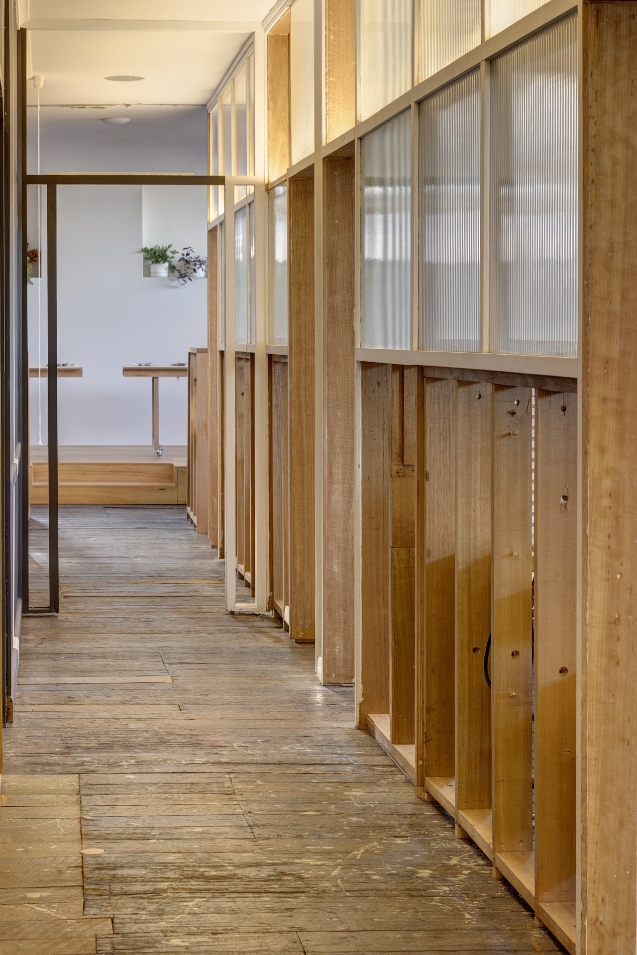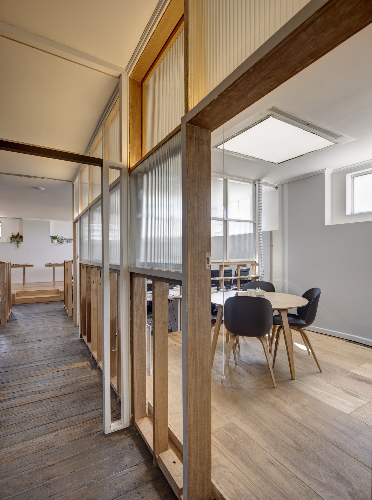 The entire fitout is a cannibalisation of what was already there. The old wall finishes were removed, revealing beautiful 1960s framework carpentry, and a series if glazed partition and windows. All were removed and reassembled into a new configuration. New shelving was made from residual waste. Only the cabling for power and internet was new. The resulting spaces and office organisation is a result of accepting these constraints, with a wit and humour in the peek holes and cubby holes adding new character to how we work compared to our old open plan configuration.