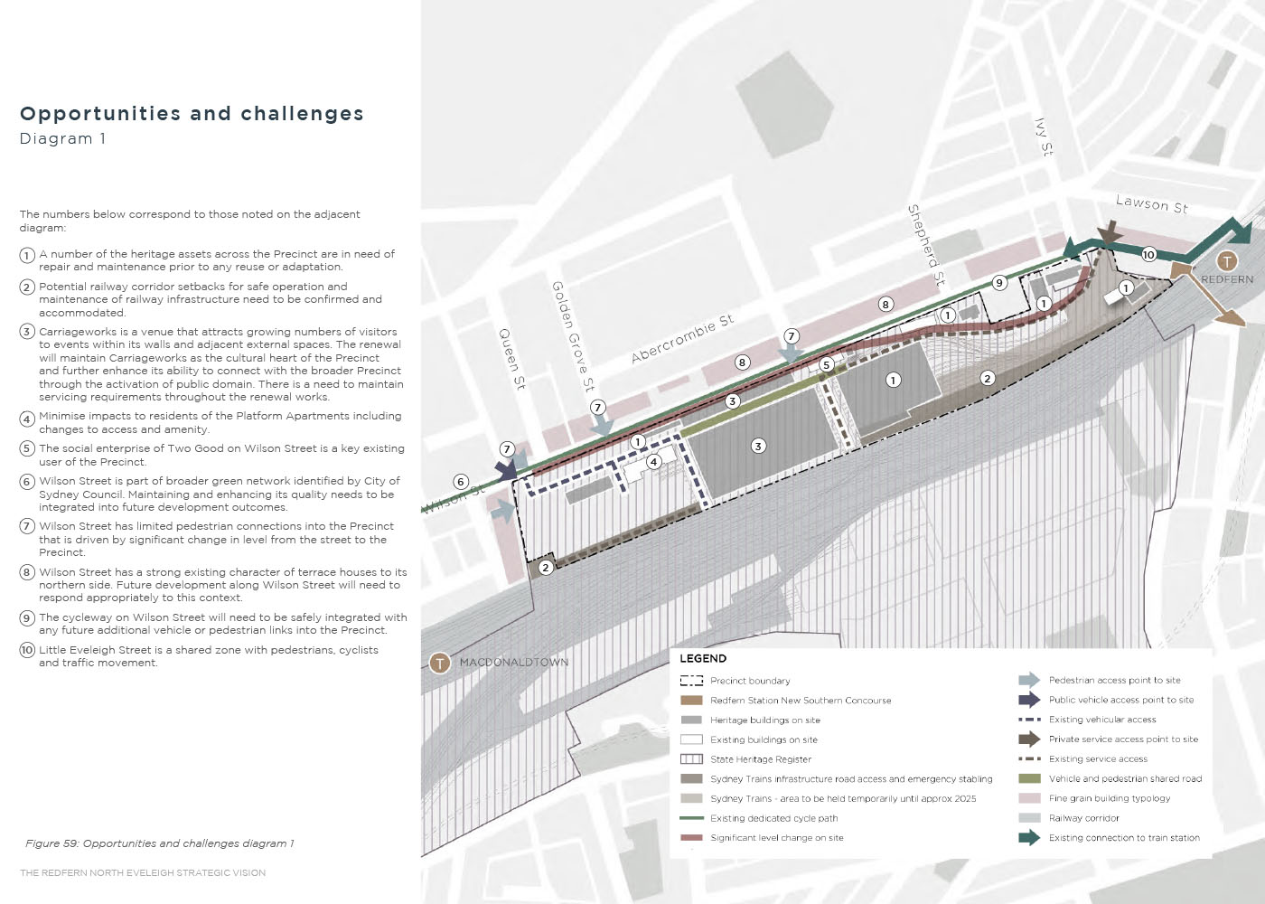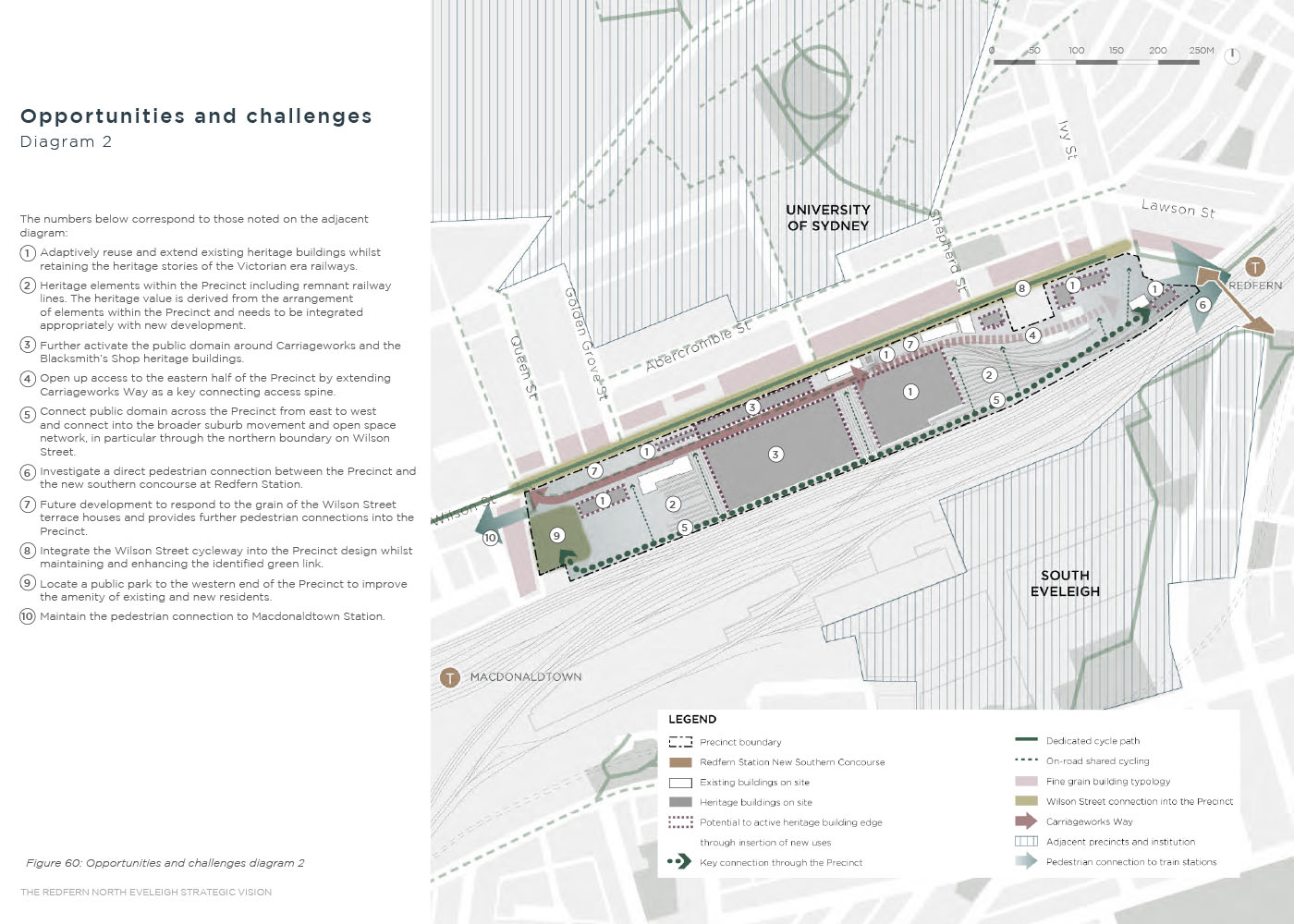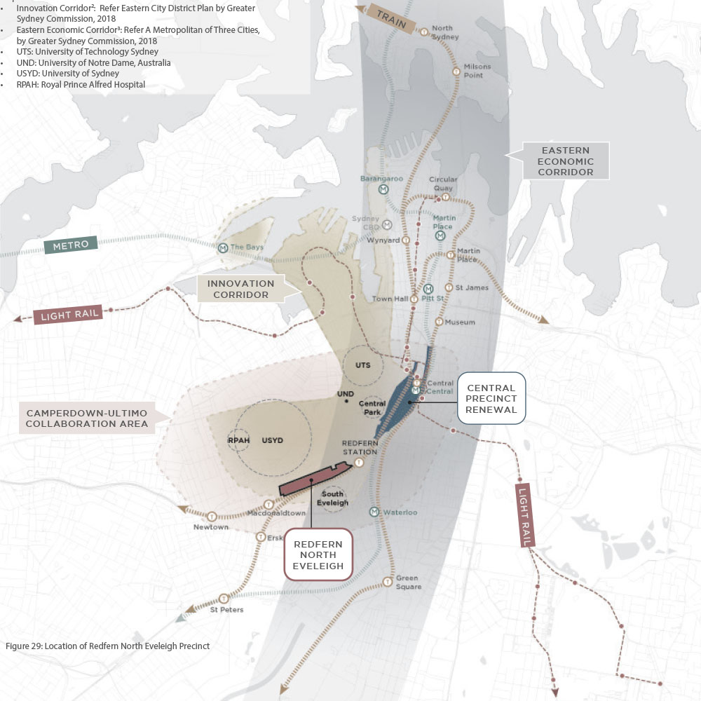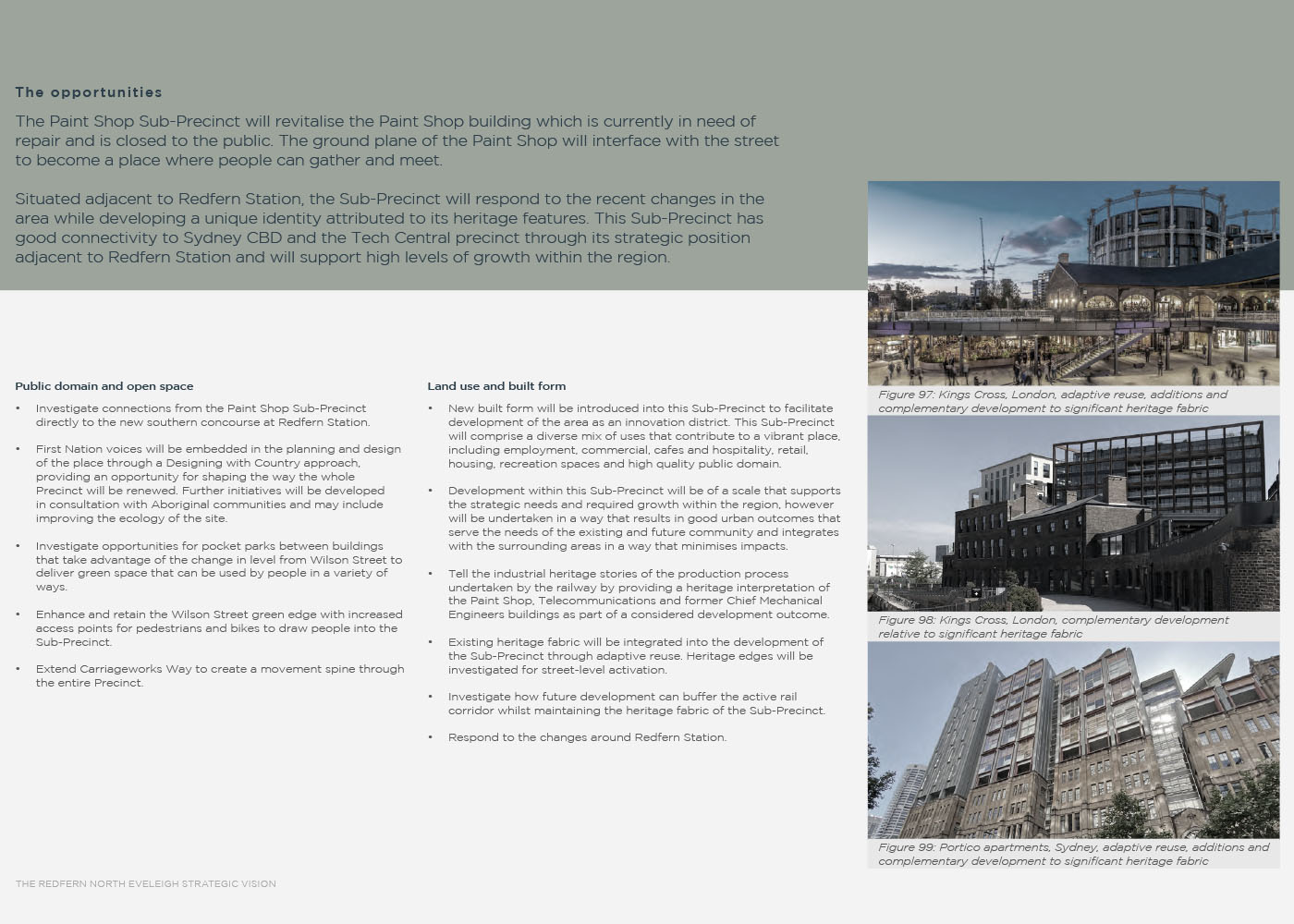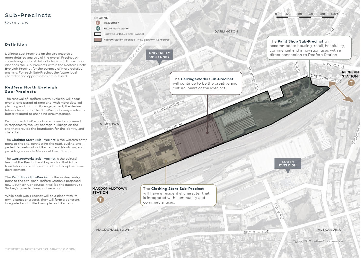 The Redfern North Eveleigh Precinct Renewal is a key city-shaping project that will open up an historic area of Sydney for the first time in almost a century. The precinct has significant heritage, a diverse cultural mix with a clear Aboriginal identity, and is supported by excellent transport connections. TERROIR was commissioned by Transport for NSW to undertake a comprehensive site investigation and preliminary design phase for the Redfern North Eveleigh Precinct. The preliminary design phase identified key considerations for Redfern Station upgrade, the Eastern Suburbs and Illawarra Line Development site, and the Redfern North Eveleigh Precinct Renewal. This work was done in consultation and collaboration with Transport for NSW and their key representatives.