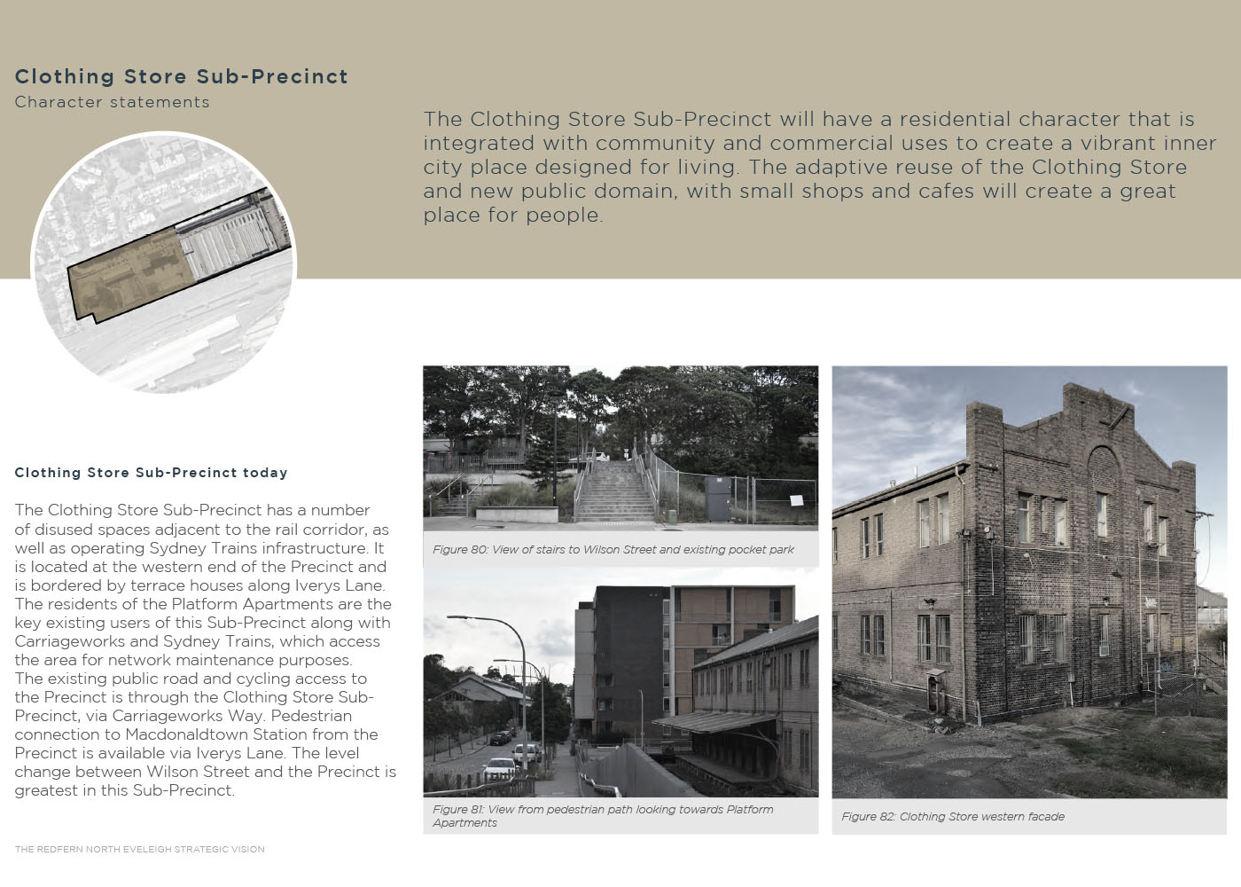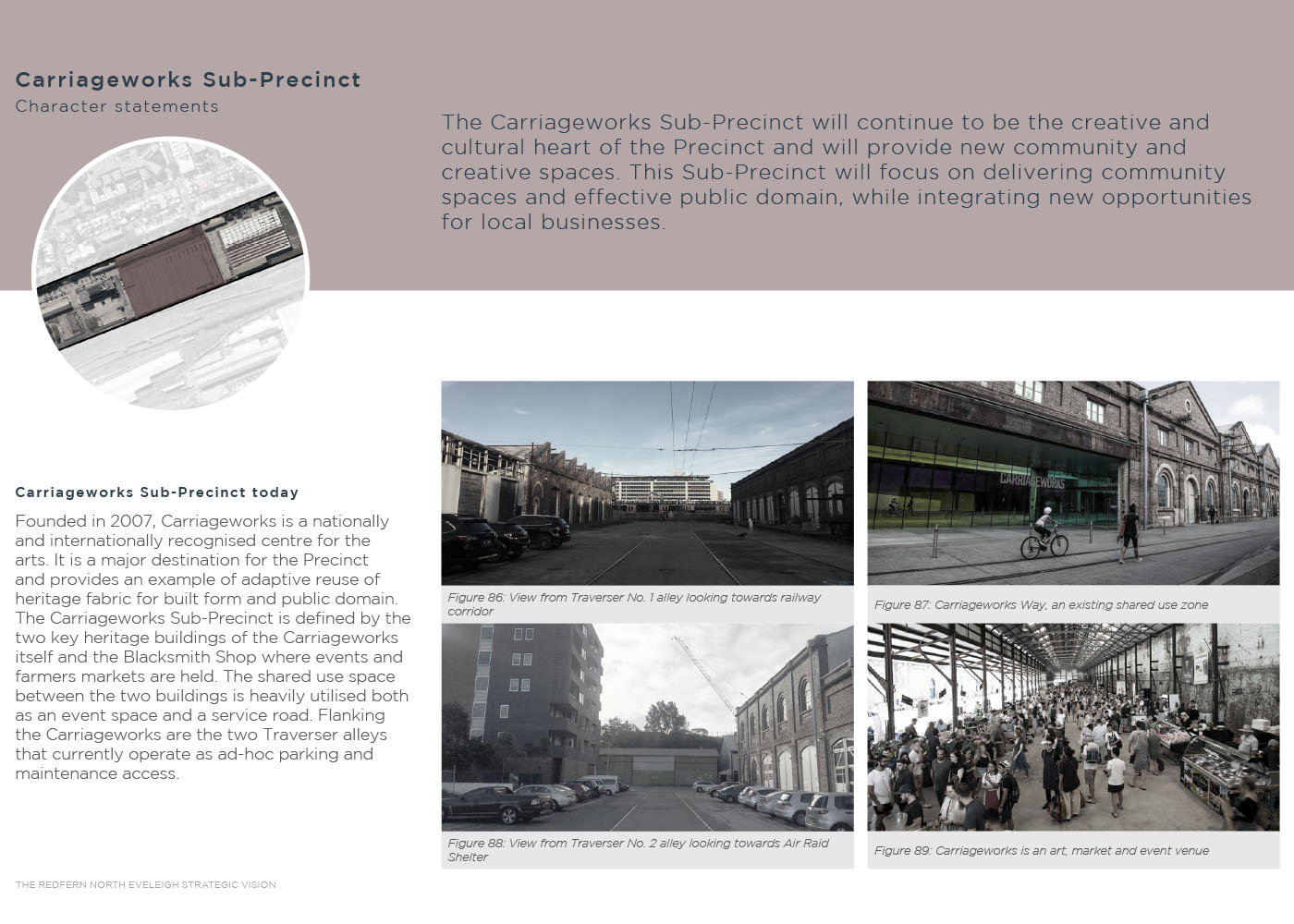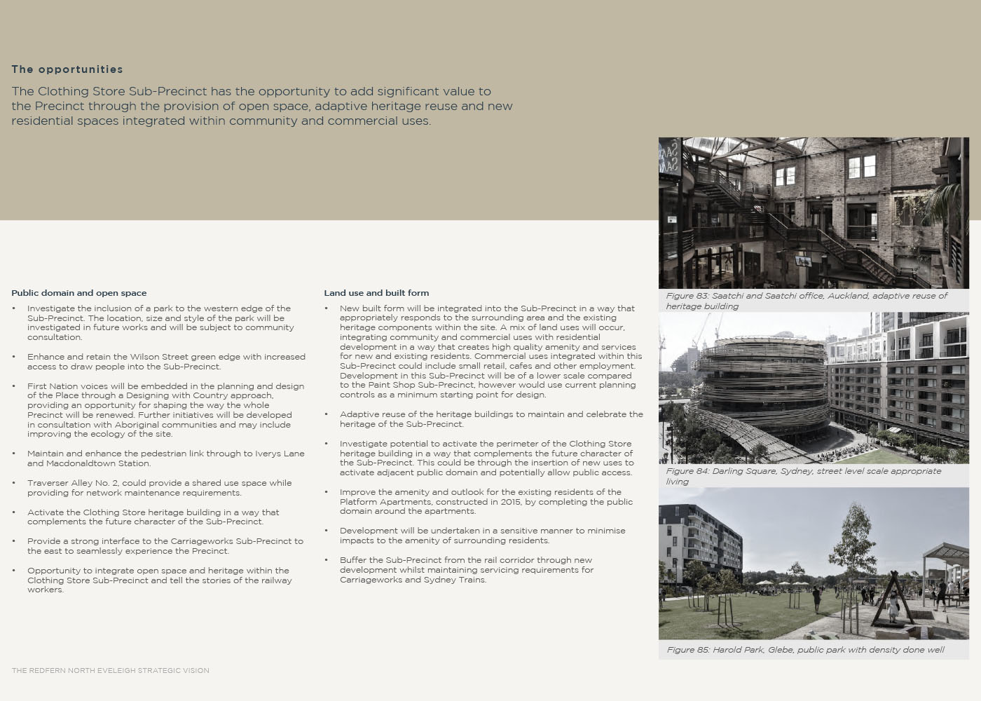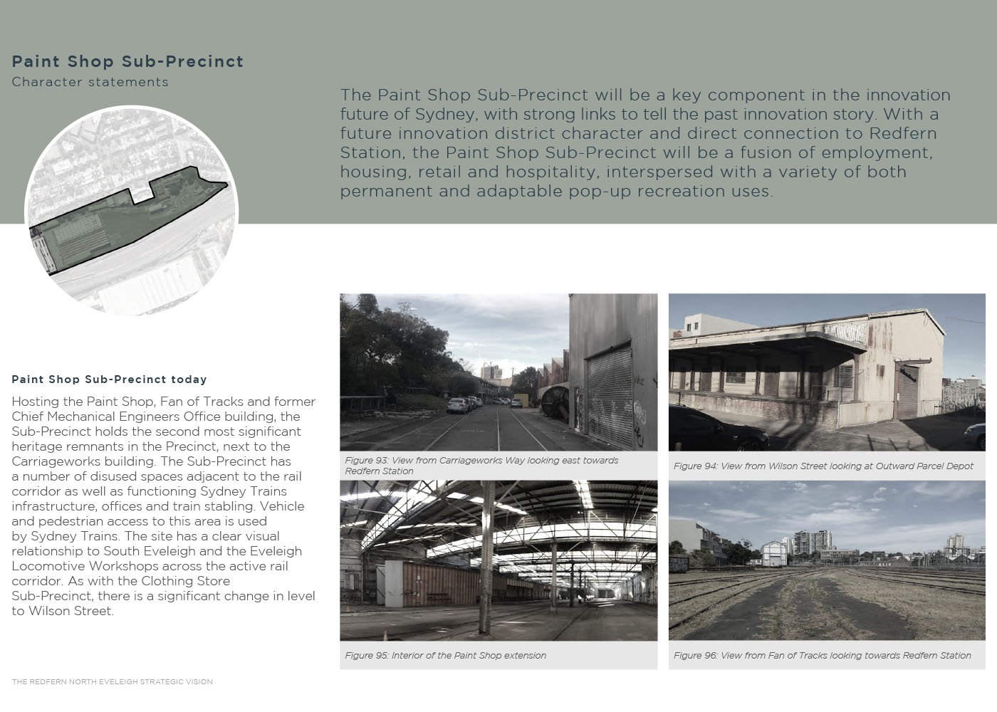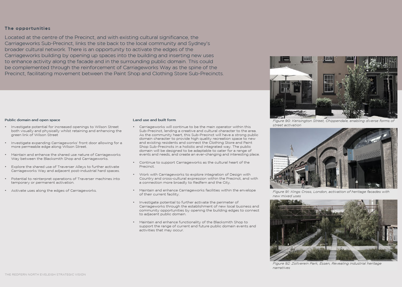 A vision was established as the first step in the new strategic planning process for the renewal of the precinct. The Redfern North Eveleigh Precinct will be a connected centre for living, creativity and employment opportunities that support the jobs of the future. An inclusive, active and sustainable place for everyone, where communities gather. To guide the vision of the precinct, a series of principles were developed and grouped into key themes. These principles were put in place to inform future planning on the site, and consider the Transport for NSW priorities of sustainability (environmental, economic and social) , with opportunities for adaptability and an overarching requirement to deliver a sustainable precinct.