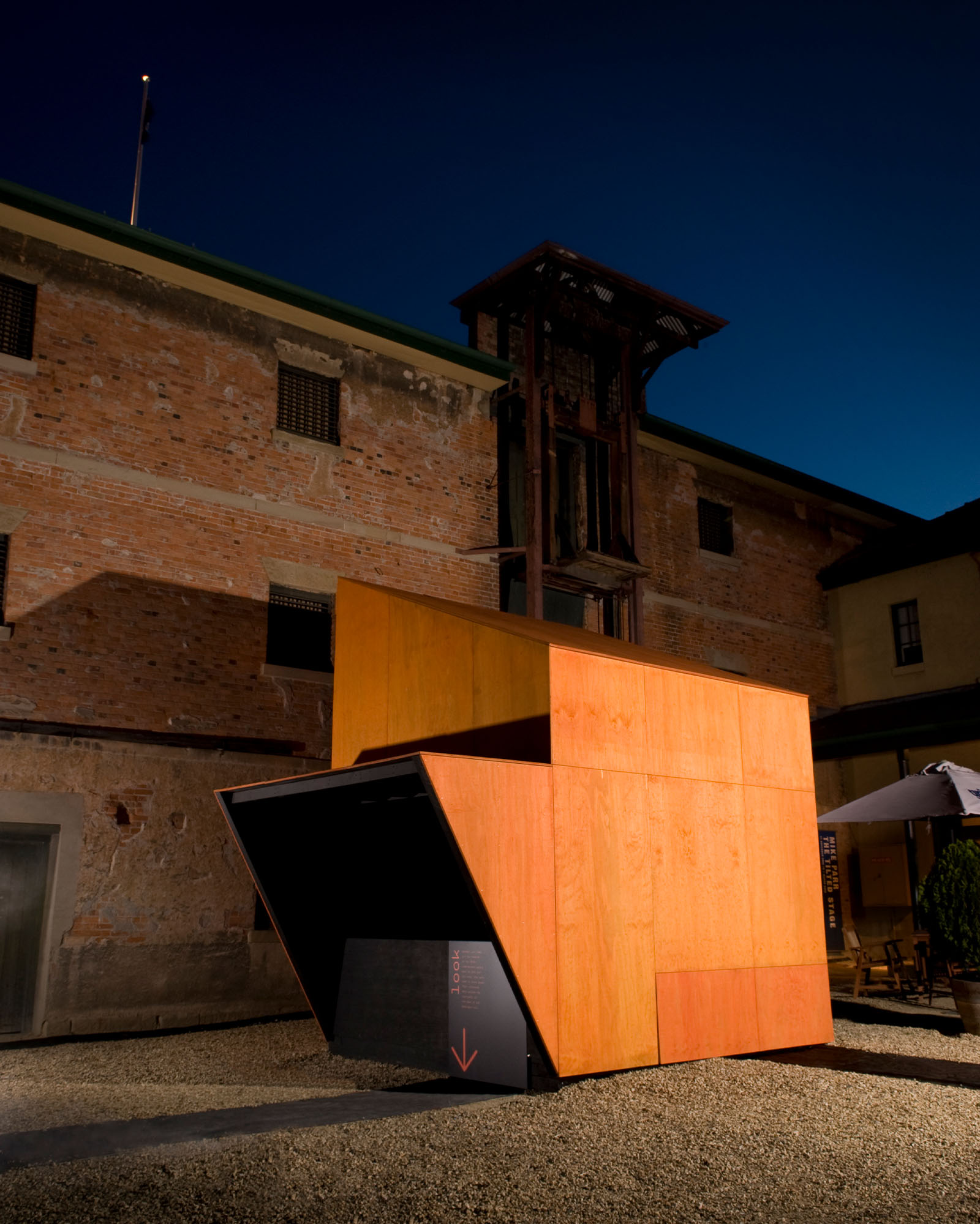 This was one of a number of small structures intended to reveal hidden layers of the TMAG site while also choreographing a journey through it. The mute quality of the building is contrasted by the main aperture, where during the day, visitors can stand under weather protection and view down into the dig, while at night a floodlight emerges from the cavity, recalling the work of Gregory Crewdson in the uncanny and unexpected.